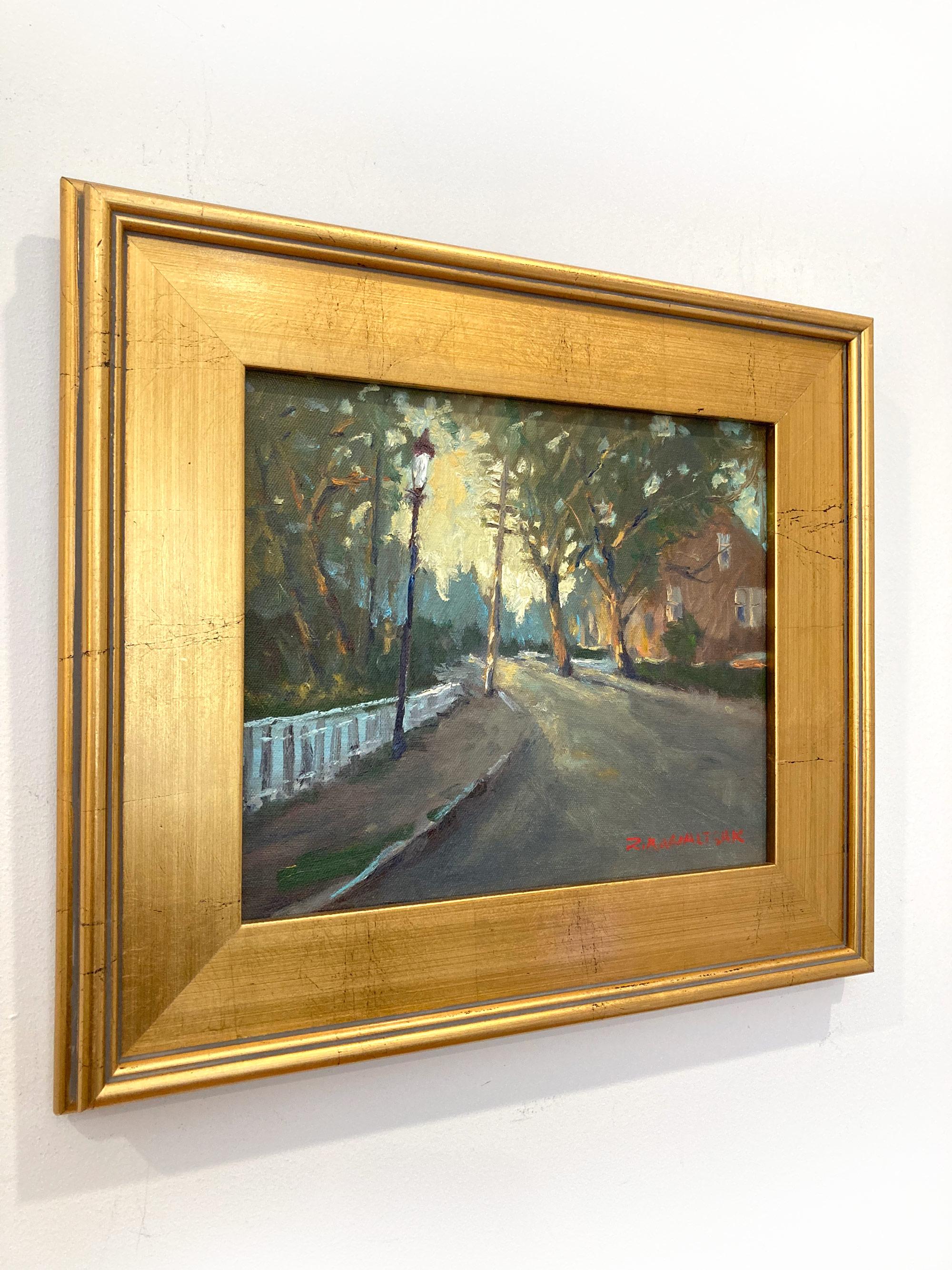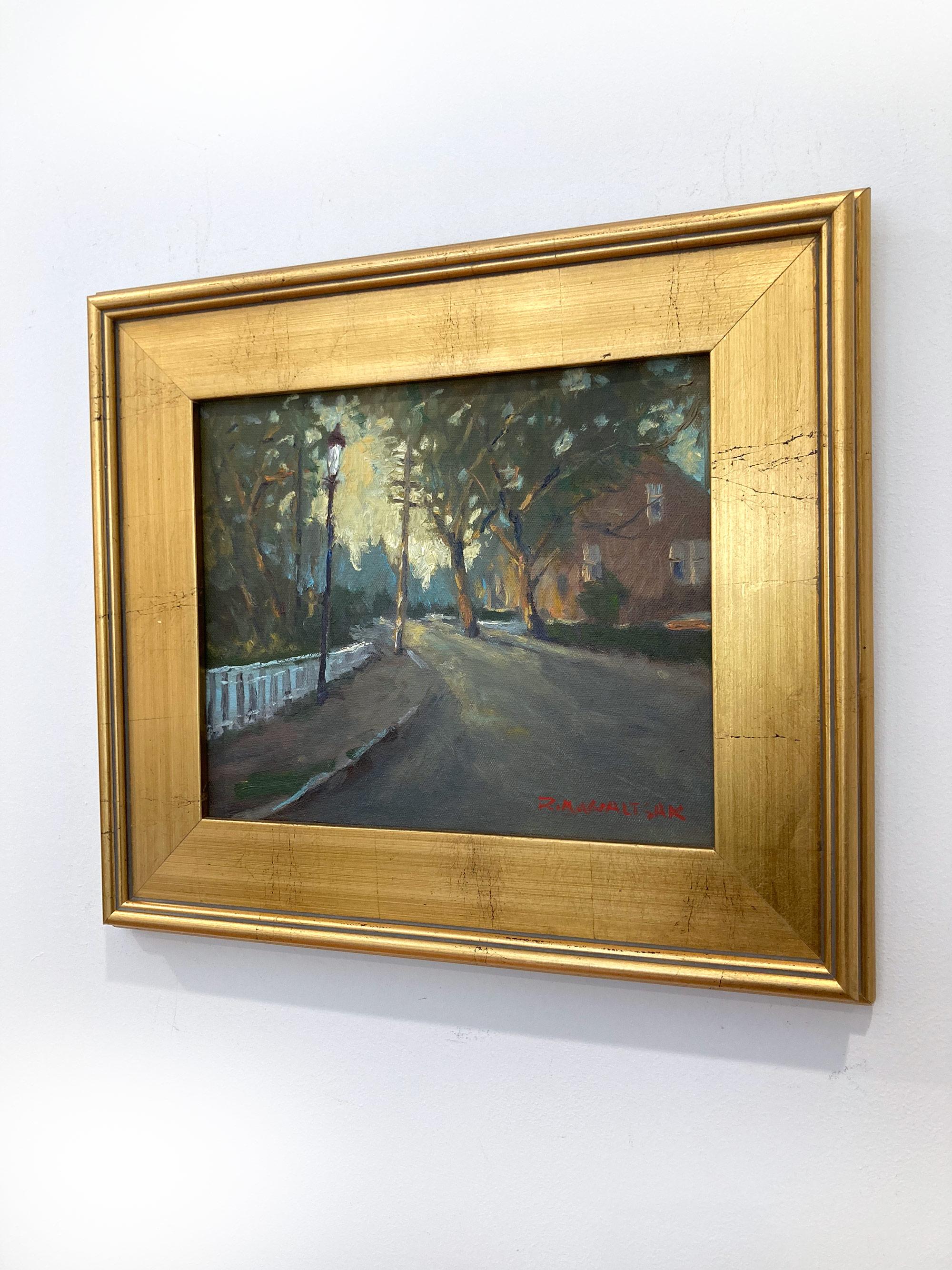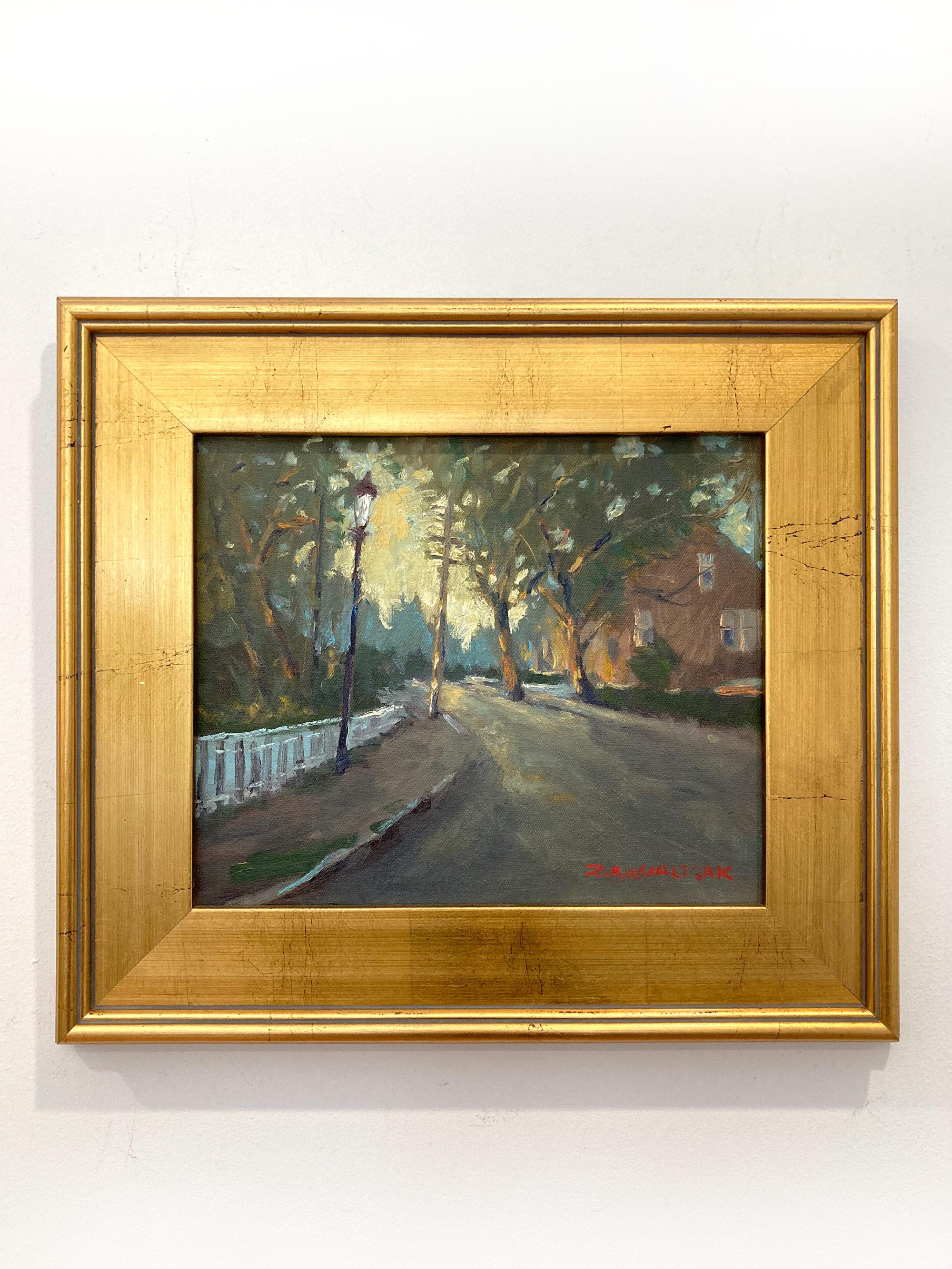 A wonderful impressionist pastoral landscape with beautiful color tones throughout. Waltsak has portrayed this piece in a most intimate, yet energetic way, and has packed much feeling into this vibrant work. It is almost as if we are there on that warm day, brimming with light coming through the green leaves giving a beautiful feeling of nostalgia. The sunset is stunning sight, Robert Waltsak is known for capturing the beauty and simplicity of our times, depicting everyday life; the flower market in the morning, New York City views, villages, farms, and intimate moments shared between friends. Waltsak engages his audience with the quick use of brushwork and great attention to picking up the energy passionately of his subjects. Many of his paintings are depicted in recognizable historical settings and this piece is an excellent example of this as he captures warm sky with lush greenery making a breathtaking sight. This painting is oil on board and it is signed by the artist lower right, it comes housed in a plein air gold tone wood frame with hanging wire on verso ready to be displayed.