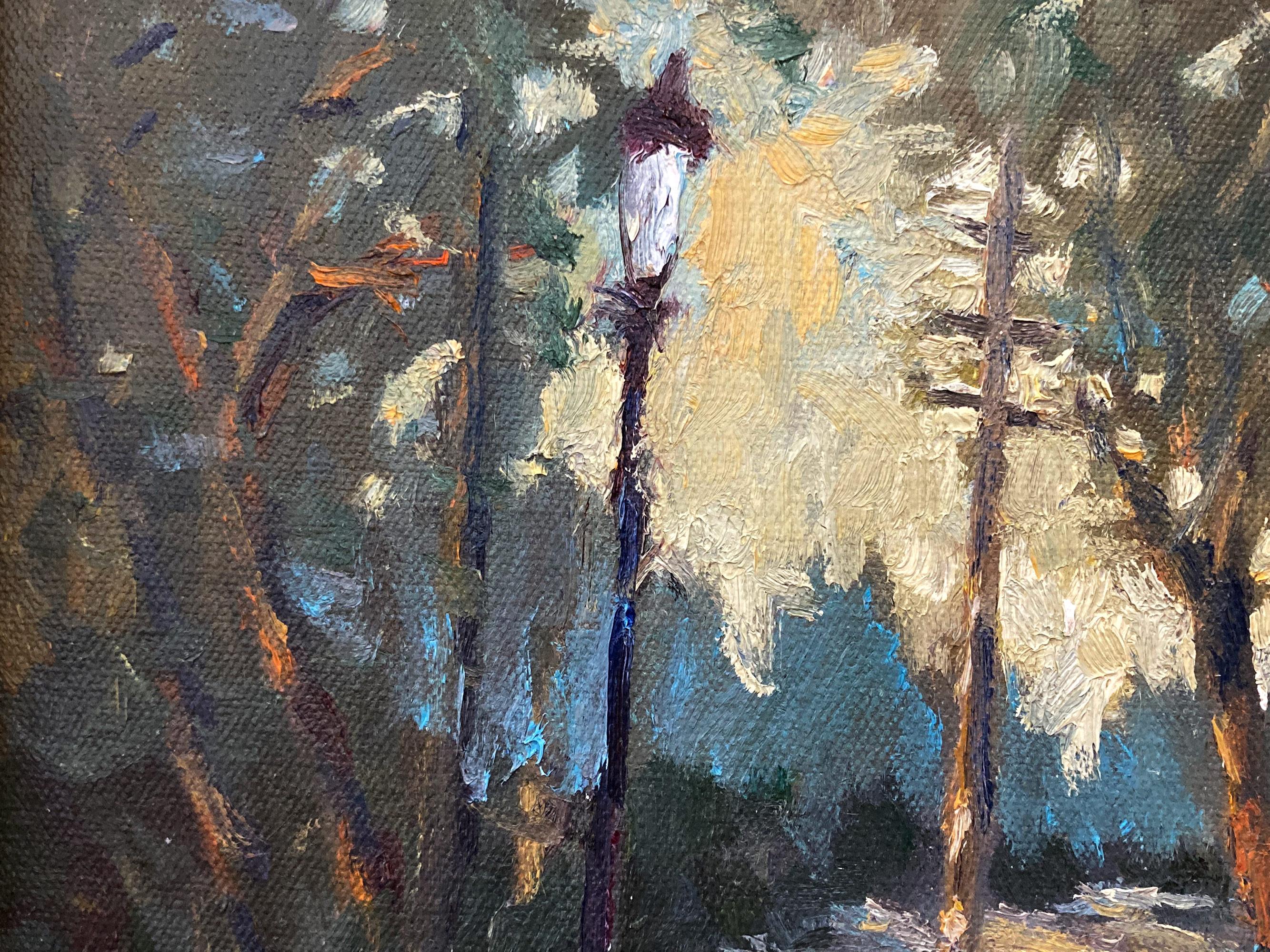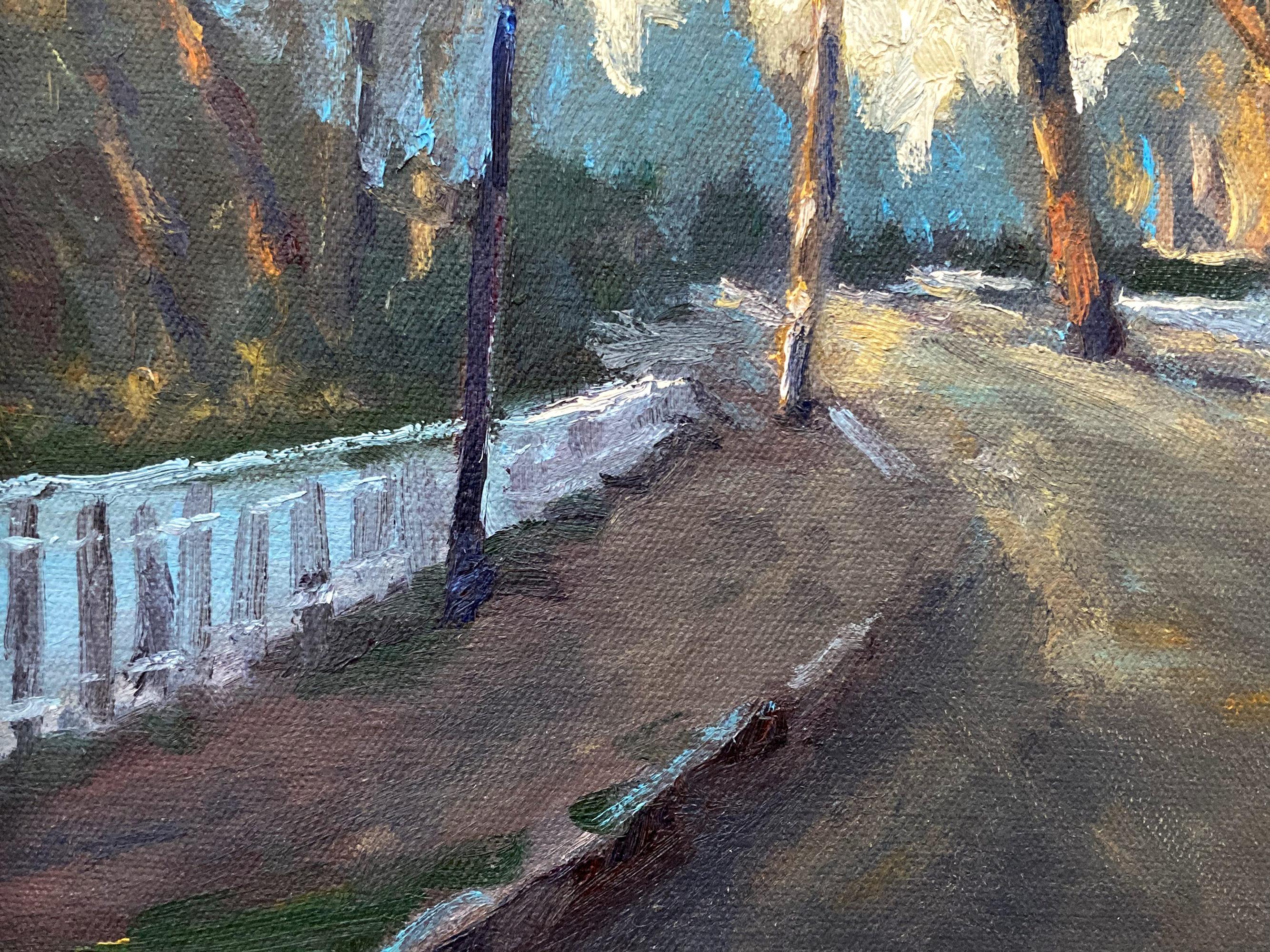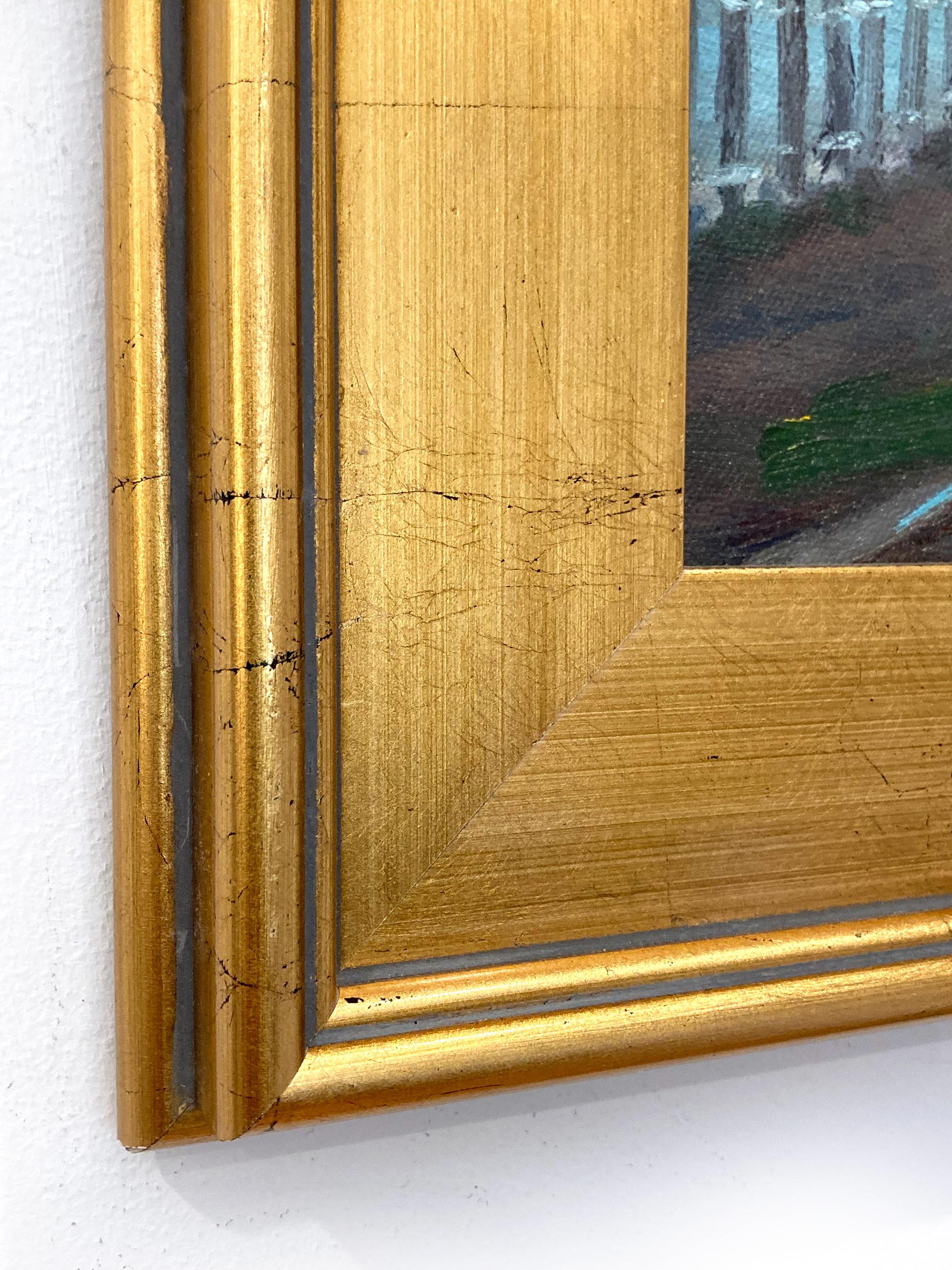 A wonderful impressionist pastoral landscape with beautiful color tones throughout. Waltsak has portrayed this piece in a most intimate, yet energetic way, and has packed much feeling into this vibrant work. It is almost as if we are there on that warm day, brimming with light coming through the green leaves giving a beautiful feeling of nostalgia. The sunset is stunning sight, Robert Waltsak is known for capturing the beauty and simplicity of our times, depicting everyday life; the flower market in the morning, New York City views, villages, farms, and intimate moments shared between friends. Waltsak engages his audience with the quick use of brushwork and great attention to picking up the energy passionately of his subjects. Many of his paintings are depicted in recognizable historical settings and this piece is an excellent example of this as he captures warm sky with lush greenery making a breathtaking sight. This painting is oil on board and it is signed by the artist lower right, it comes housed in a plein air gold tone wood frame with hanging wire on verso ready to be displayed.