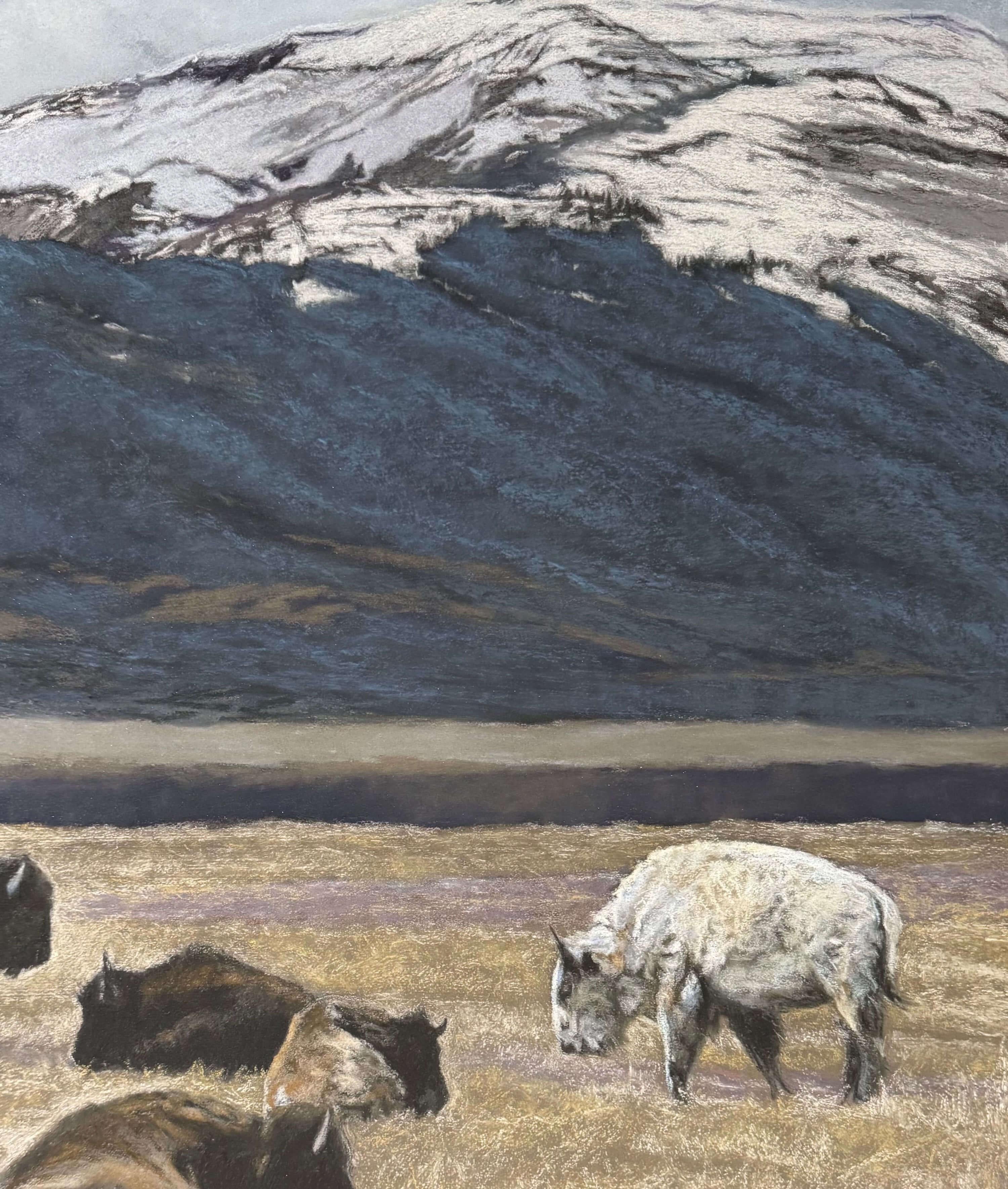 "On an overcast day there was light where the Sacred laid" by Sharon Pomales Tousey is an original, handmade soft pastel painting on board that measures 23 x 30 inches framed and is ready to hang.
