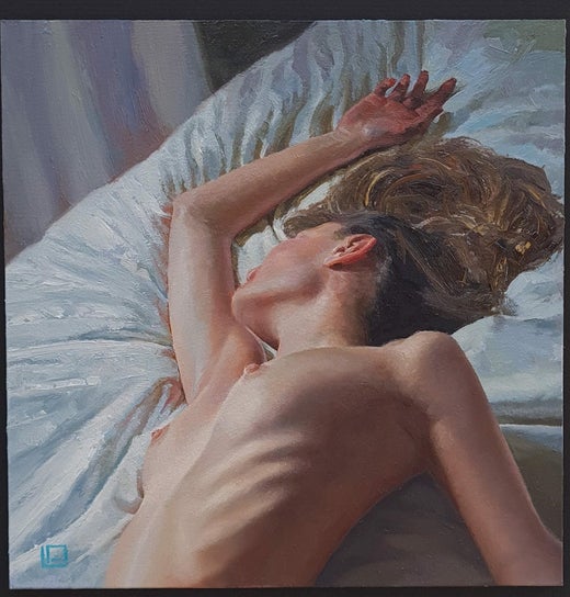 This intimate oil painting captures a moment of quiet rest and vulnerability. Painted alla prima, the artist works swiftly and expressively, allowing brushstrokes to remain visible a...