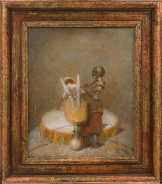 Vachagan Narazyan’s Entertainment (2023) is an original oil on canvas painting that evokes the theatrical and surreal worlds that define his mature style. Rendered in soft yet moody tones, the composition features two enigmatic figures—a puppet-like performer and a costumed character—posed atop a vibrantly rimmed circus drum...