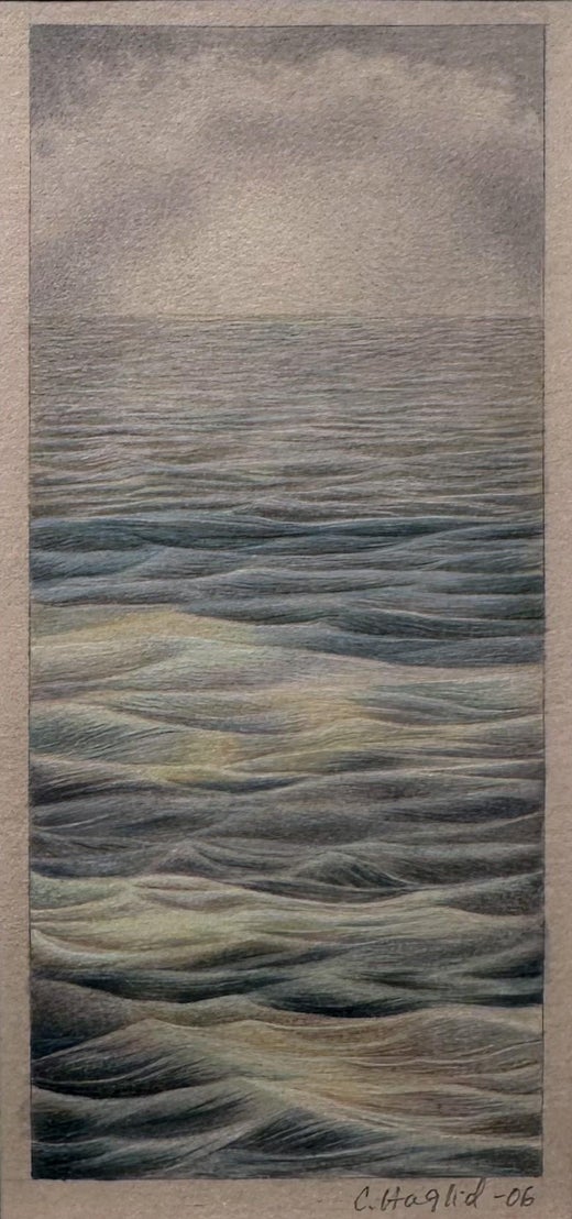 The fragility of the environment has always played an important role in Christina Haglid's work. As a child growing up on the East Coast, the ever changing seaside landscapes intrigued her. This fragile balance between nature and her subject matter is as delicate as a paper lantern floating on the ocean. "Ocean Current" captures this delicate balance in a small, exquisite painting . A lone paper lantern floats adrift on soft aquamarine water. Soft particles of light reflect in the gentle wake. This acrylic painting is on a cradled panel which is beautiful on its own or can be floated in a frame. Contact the gallery for framing options.