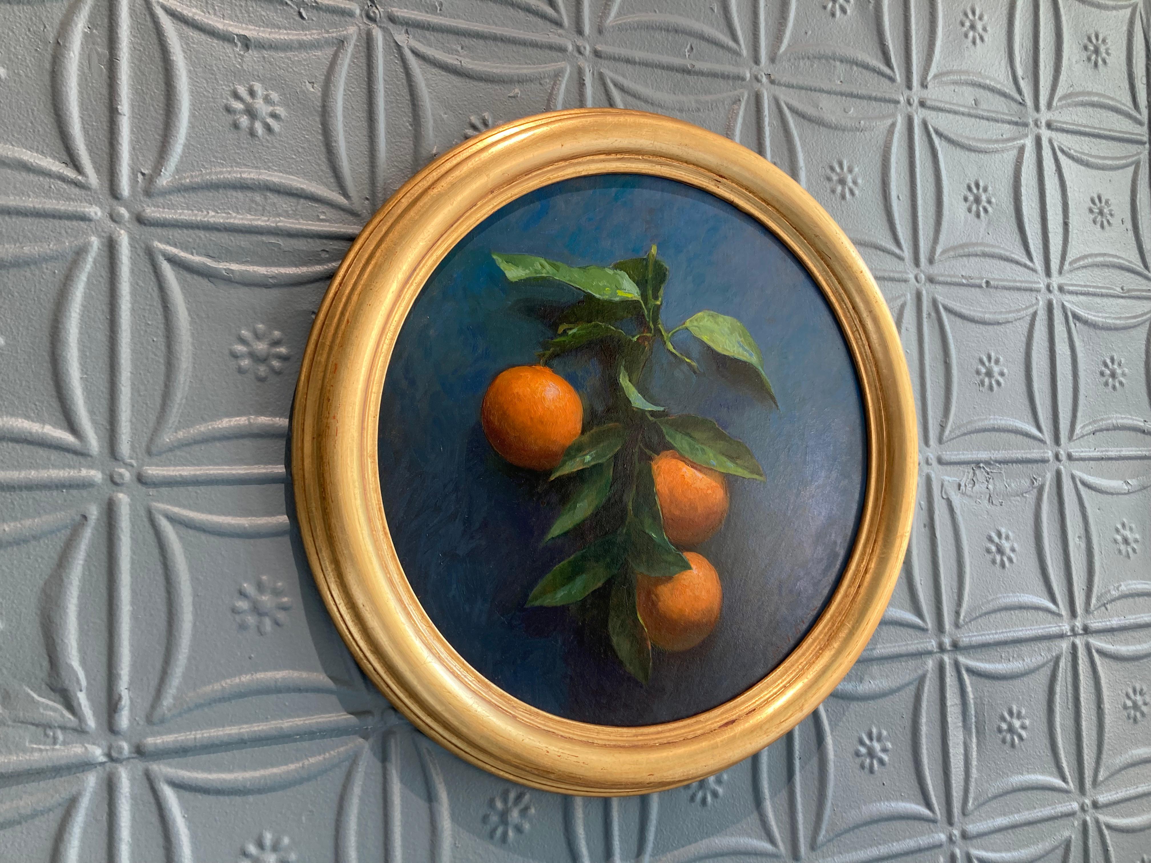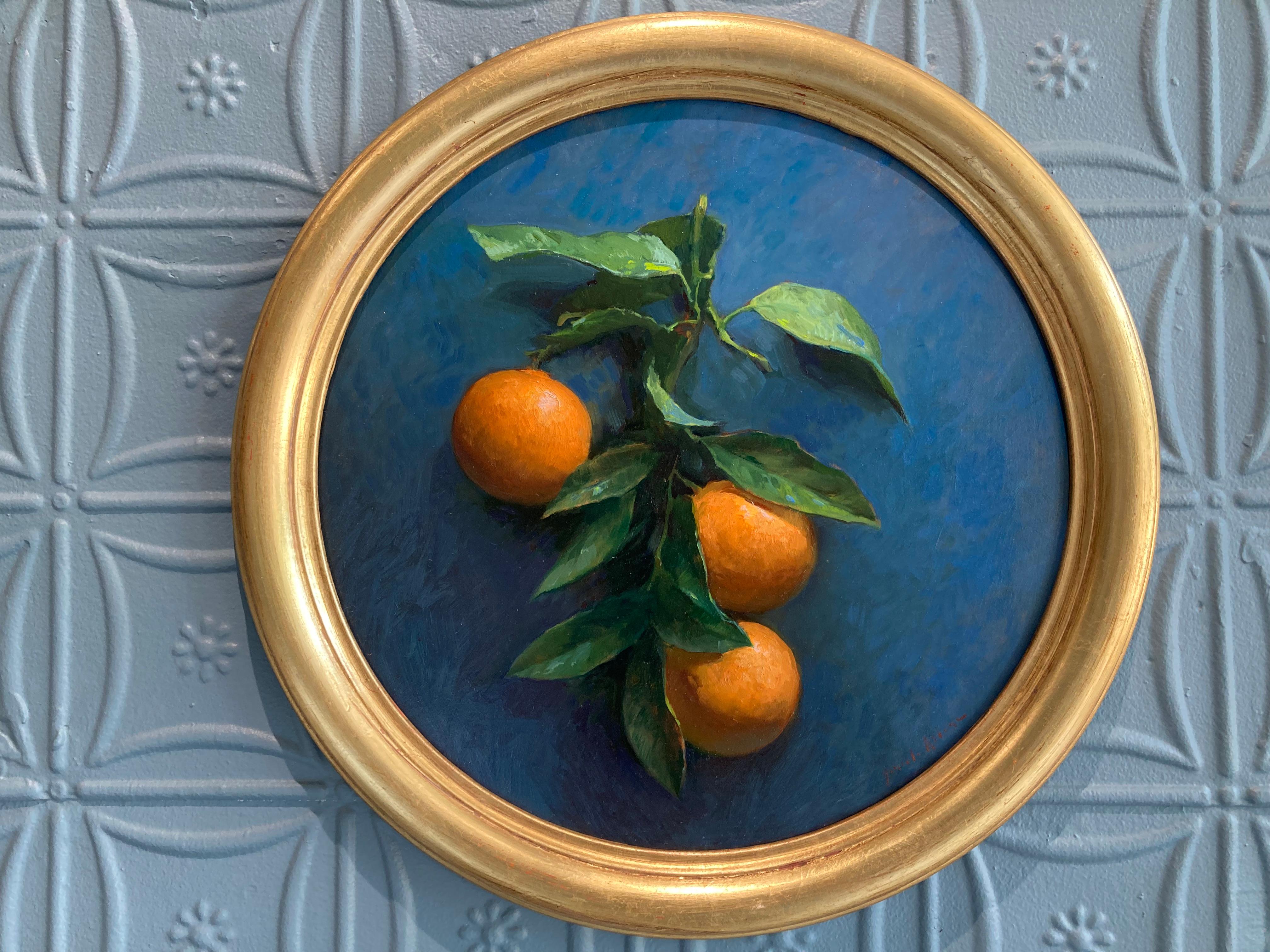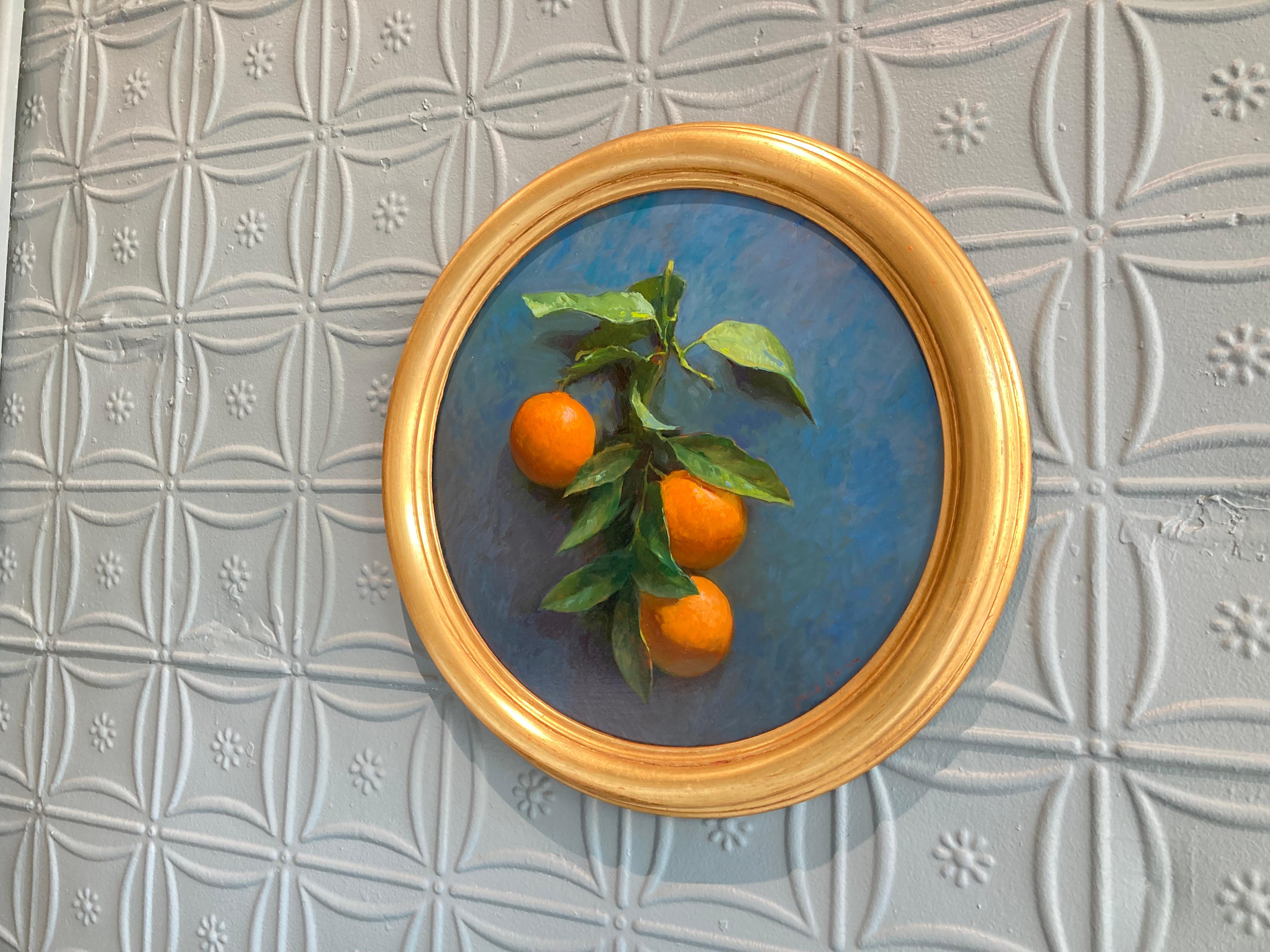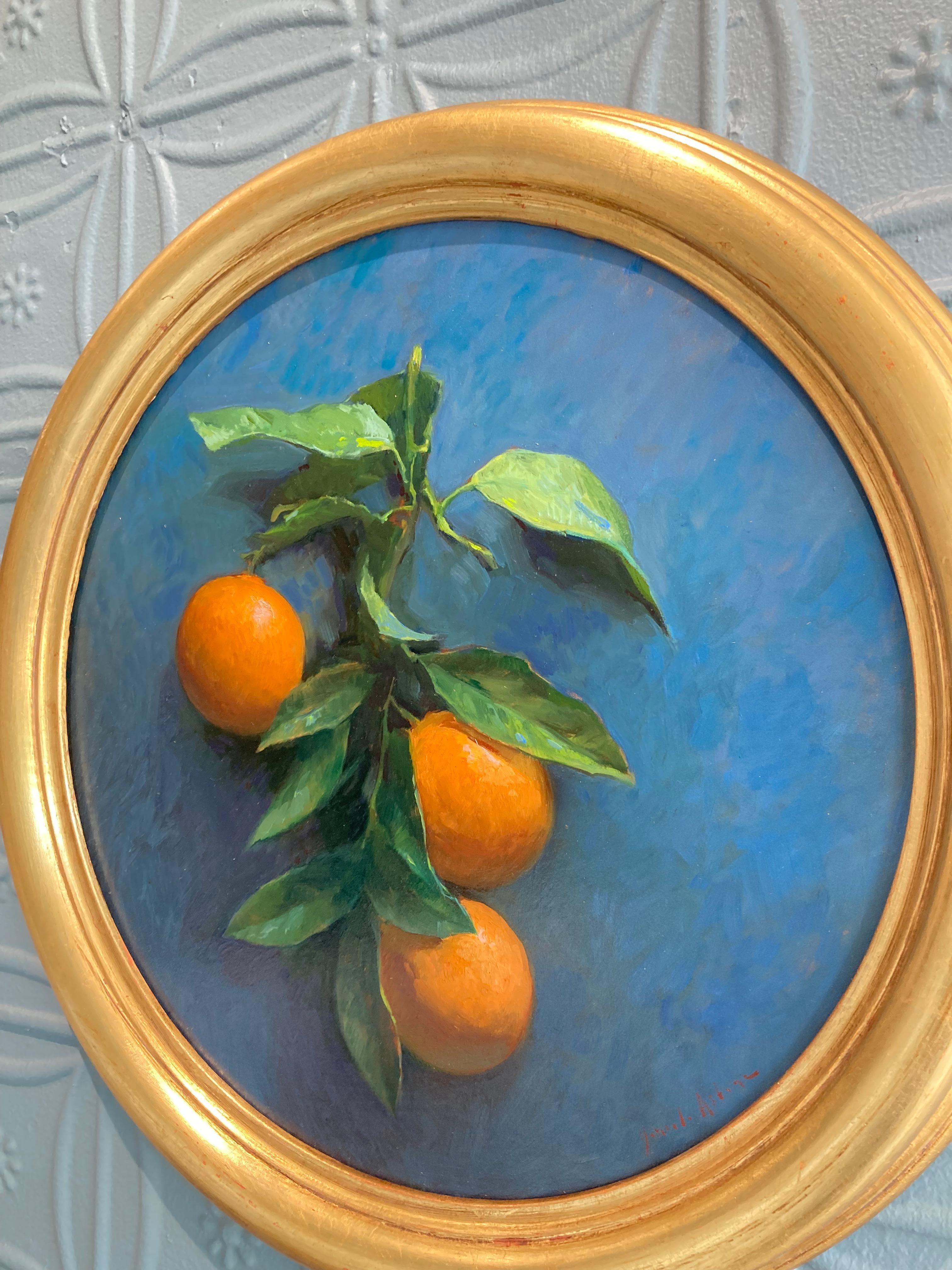 Daniela Astone"Oranges" classical still life, fresh-cut branch of oranges hanging on blue wall2024
