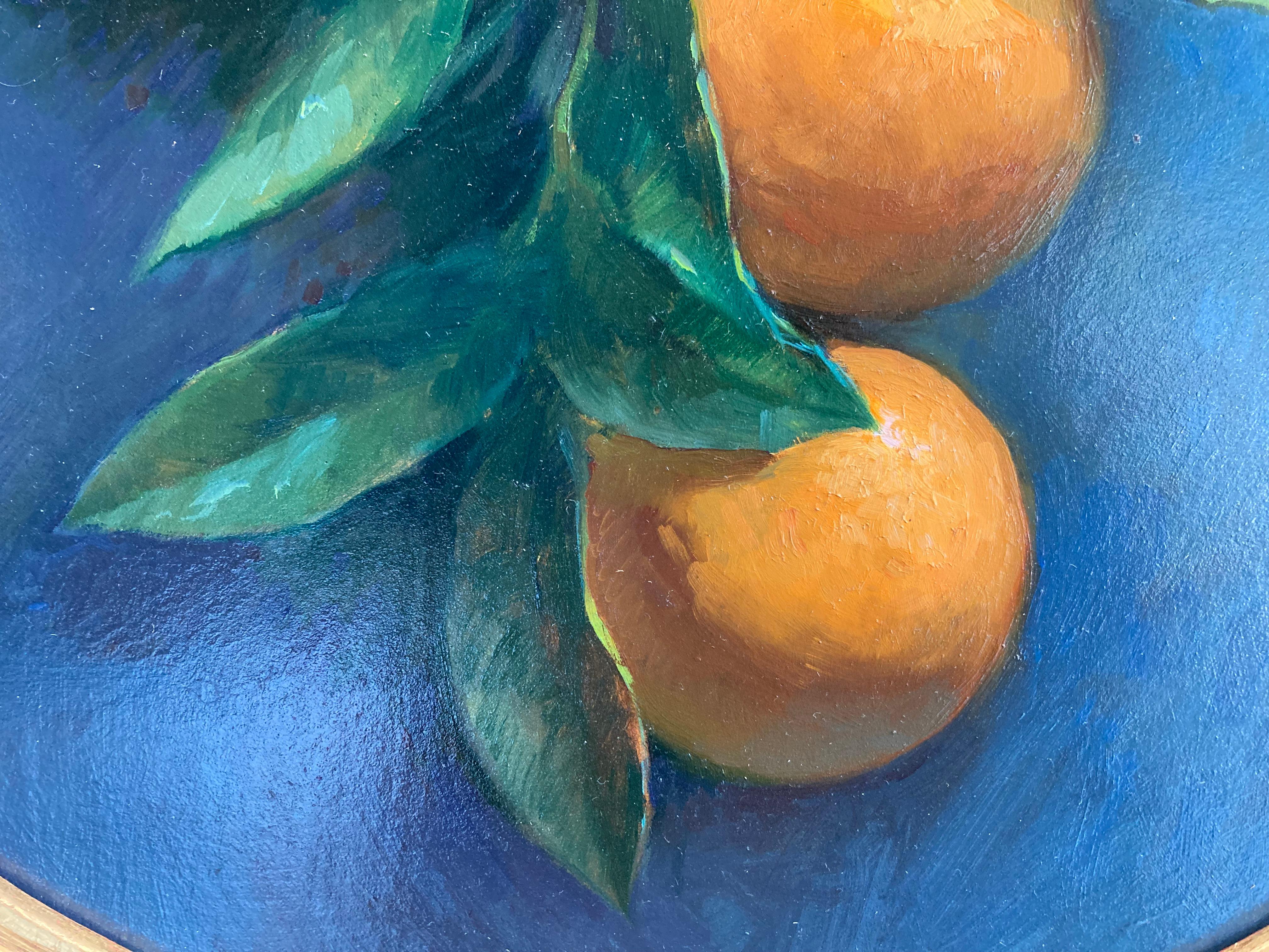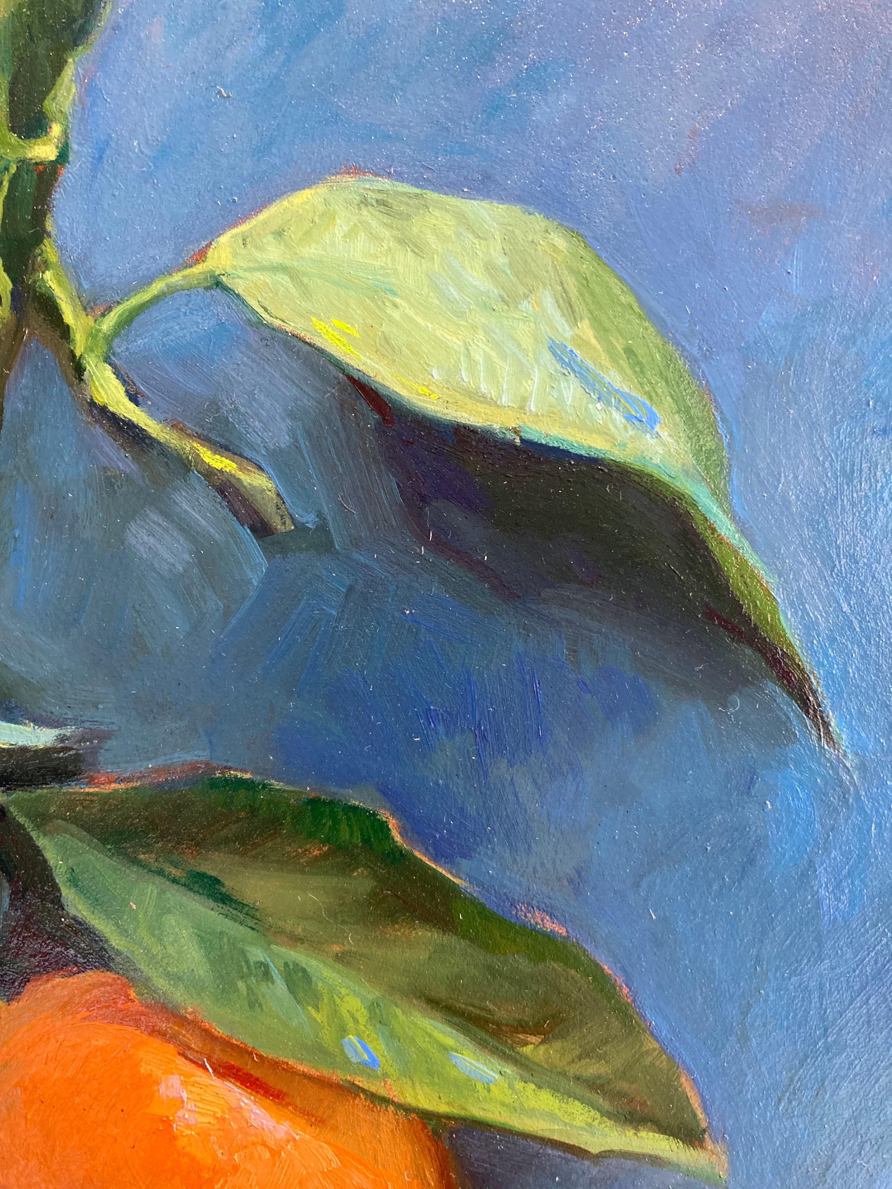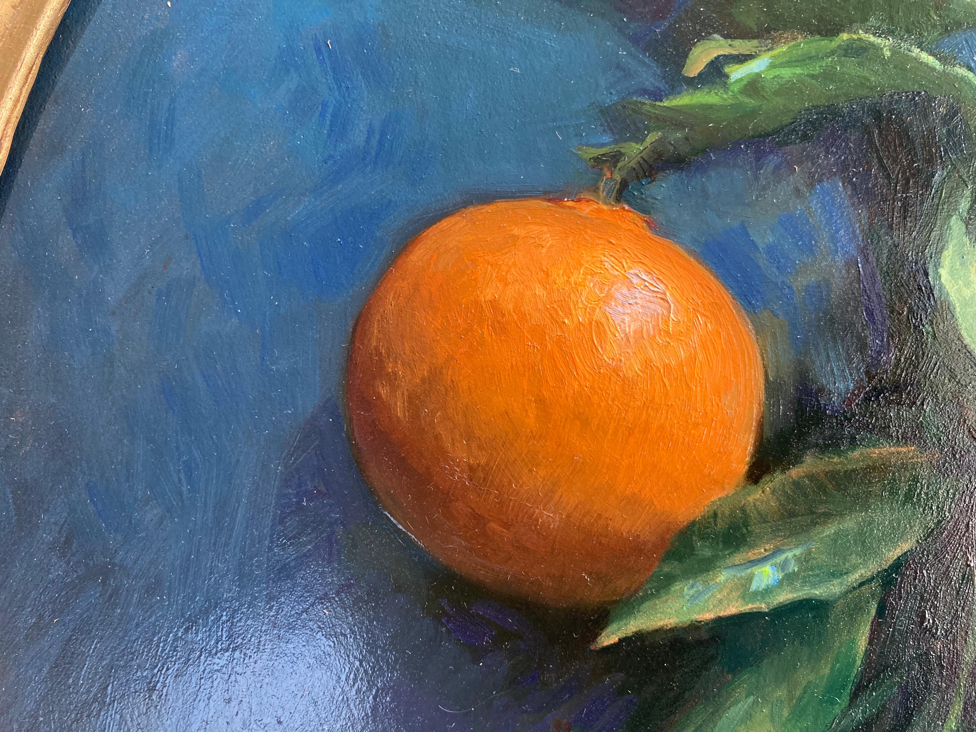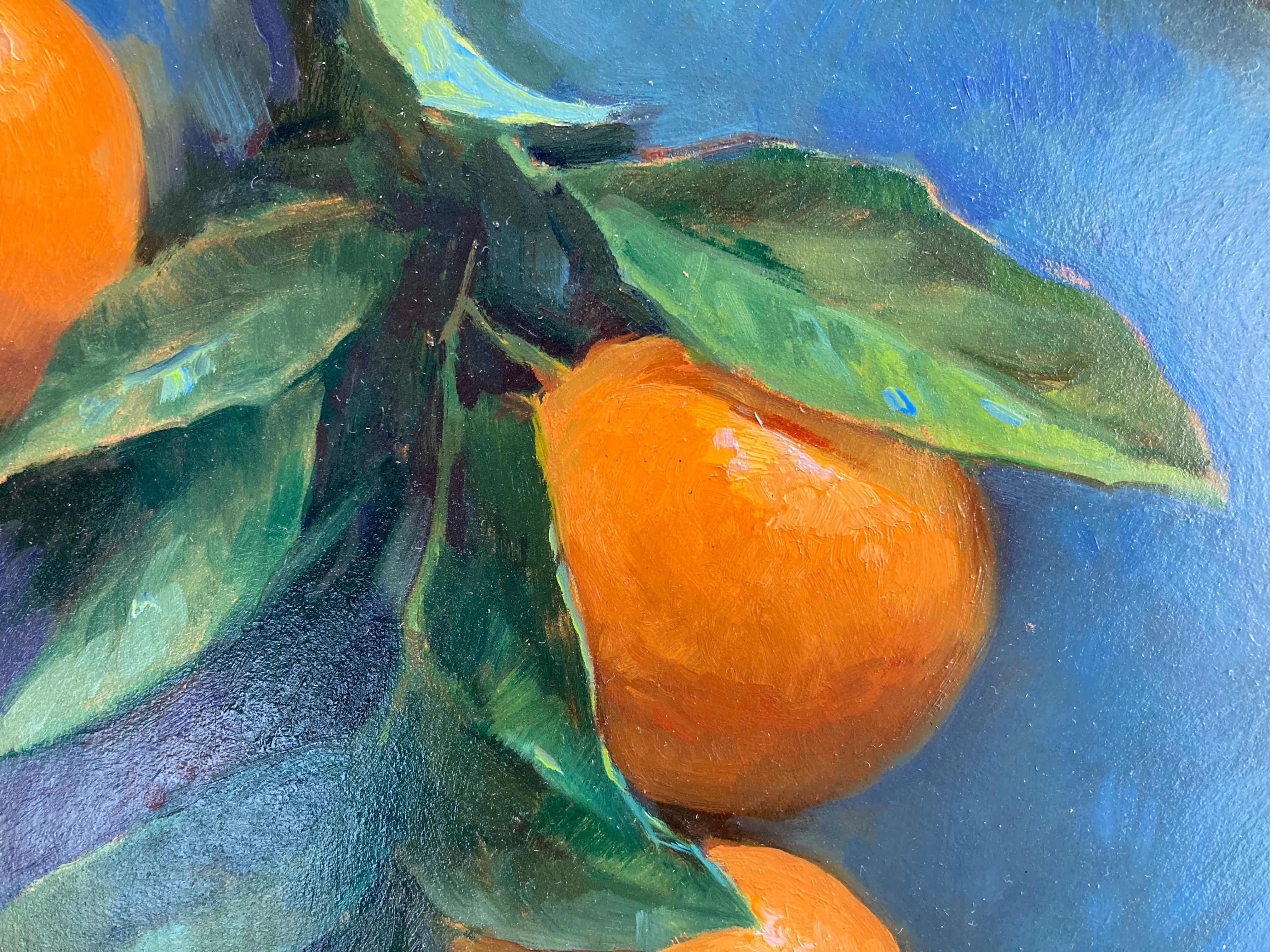Daniela Astone"Oranges" classical still life, fresh-cut branch of oranges hanging on blue wall2024