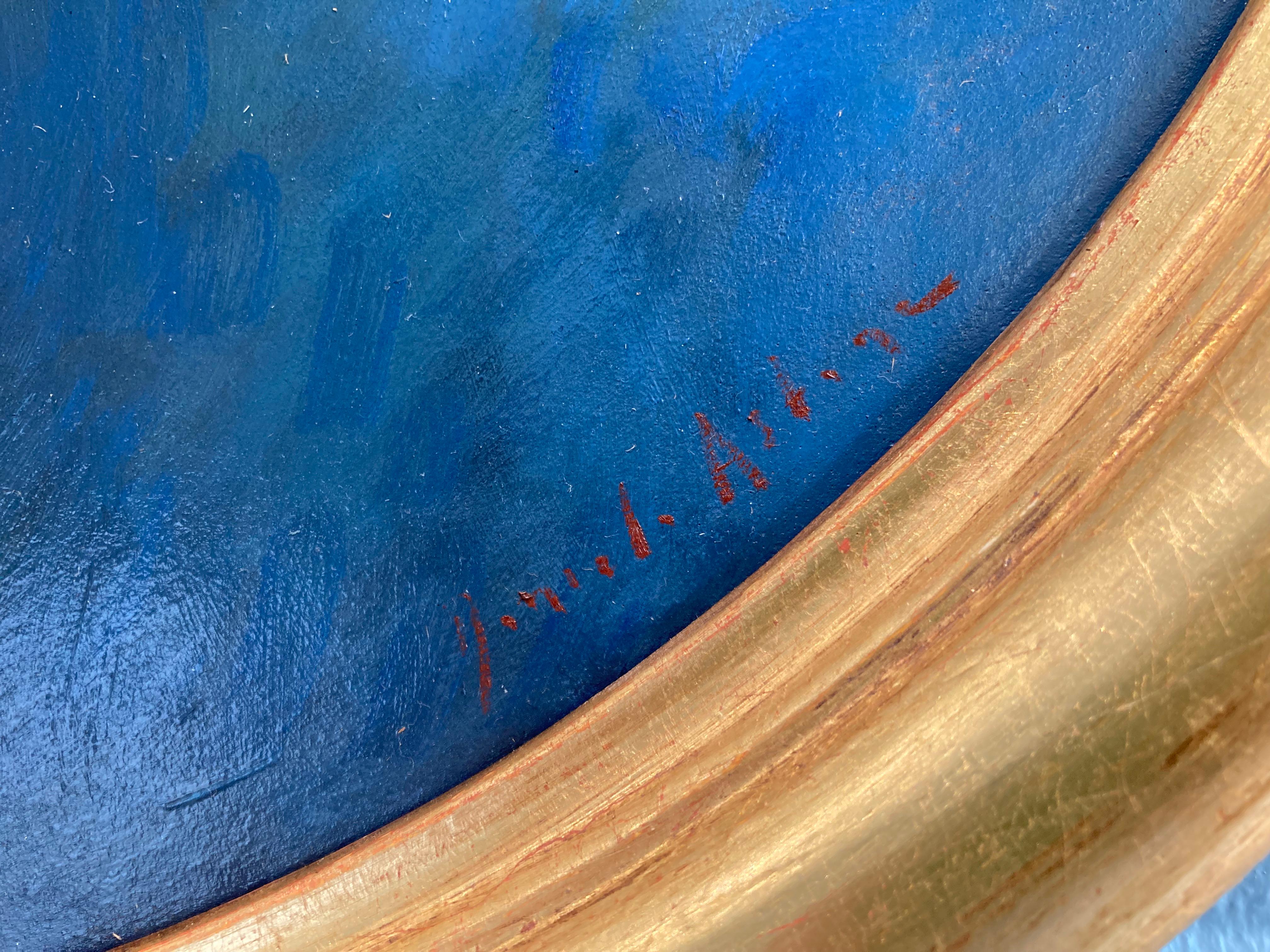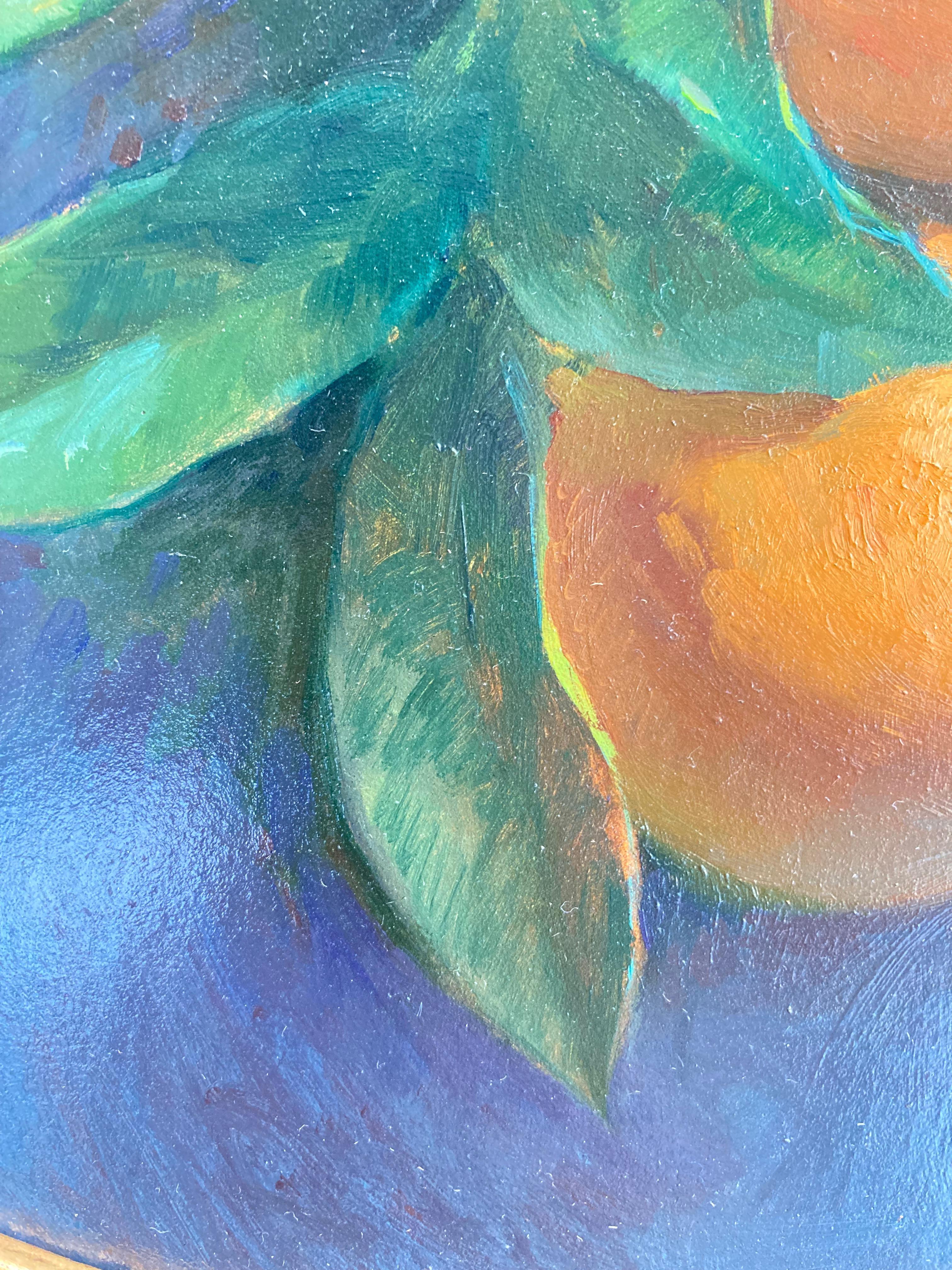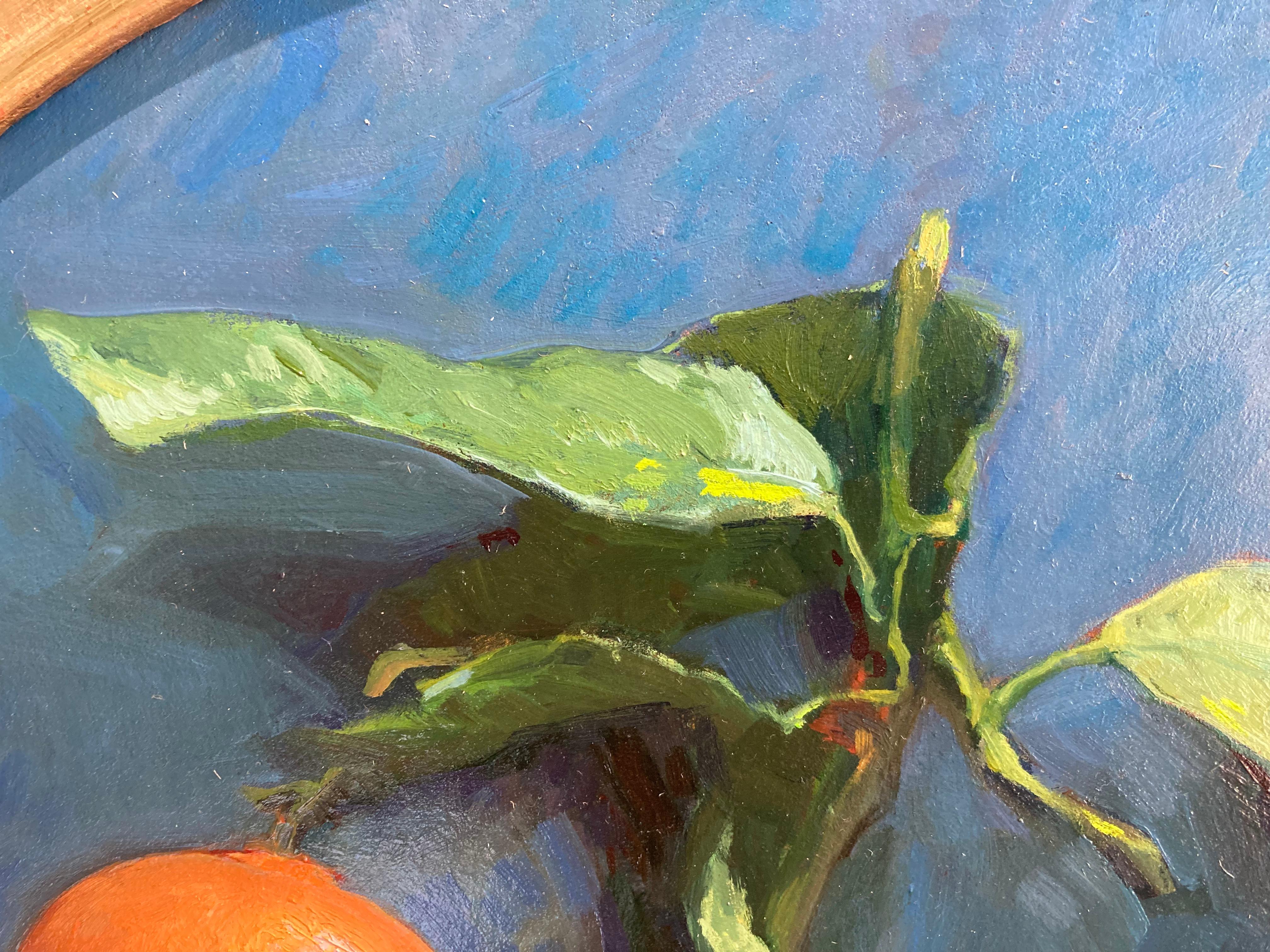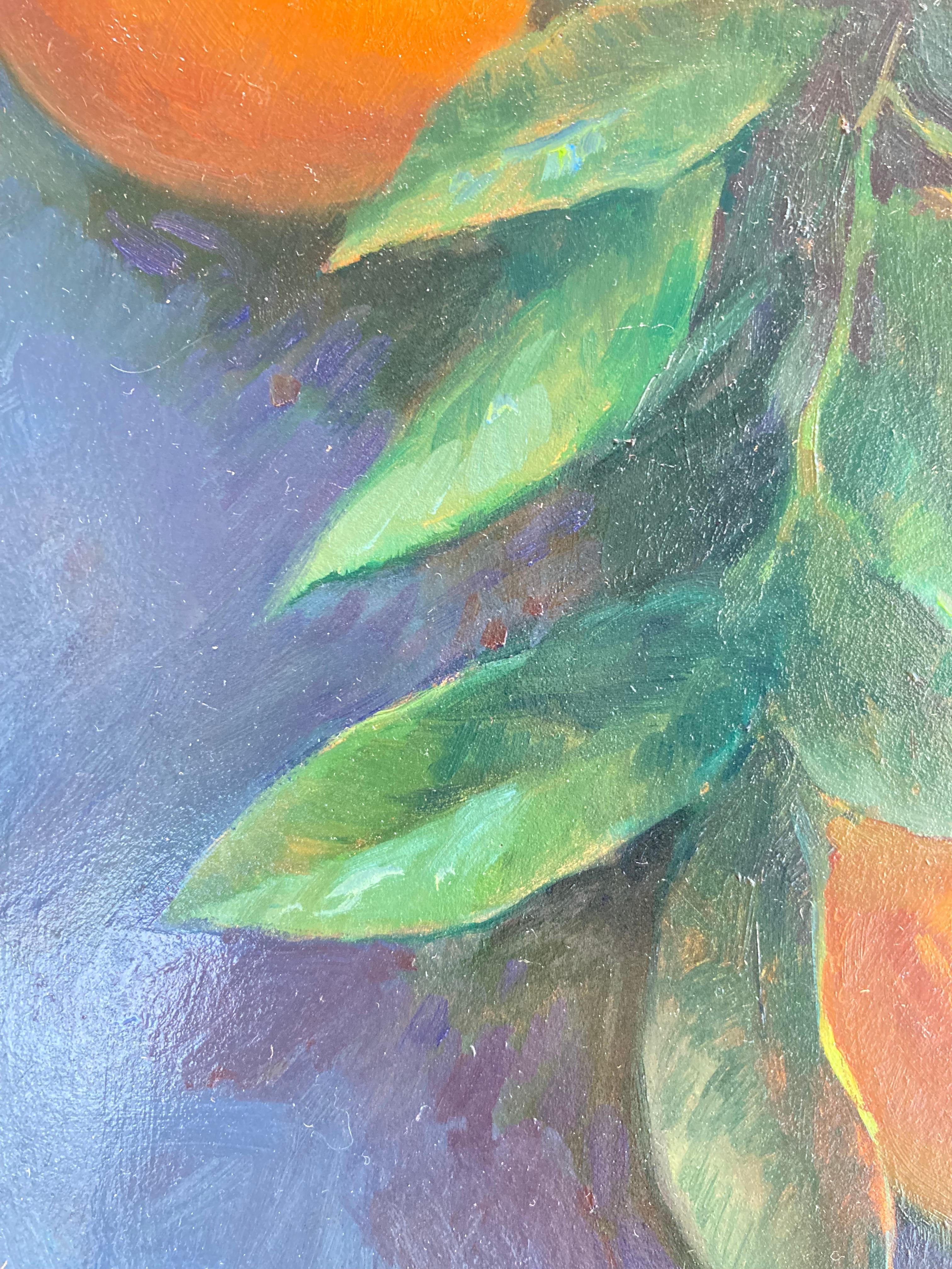Daniela Astone"Oranges" classical still life, fresh-cut branch of oranges hanging on blue wall2024