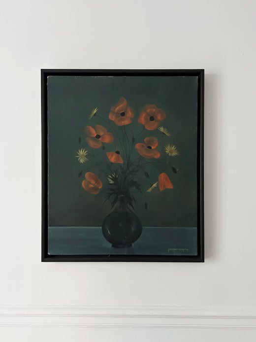 The still life with a bouquet of poppies and daisies that we present here is imbued with a sense of melancholy. It reflects the artist's attachment to a form of expressive realism. He uses color with restraint and sobriety, giving pride of place to shades of midnight blue and green.