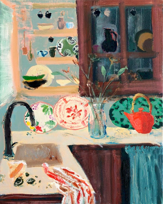 Set up with recognizable still life identifiers — a stem casually placed in a glass jar, fruit loosely strewn on a table top, ceramic tumblers or a teapot — a convivial human presence is noted, not through bodies but close narratives between objects. Proximities between a window and its reflection on the table top establishes that light is the main character. Refractions move across a surface and the effect makes a chimera of things — a mutation — lifting the weight of the familiar into a fresh reverie.