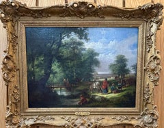 Antique 19th Century English Oil Painting Figures outside Country Cottage