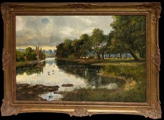 Fine Victorian Signed Oil Painting Sunset Dusk over the River with Anglers
