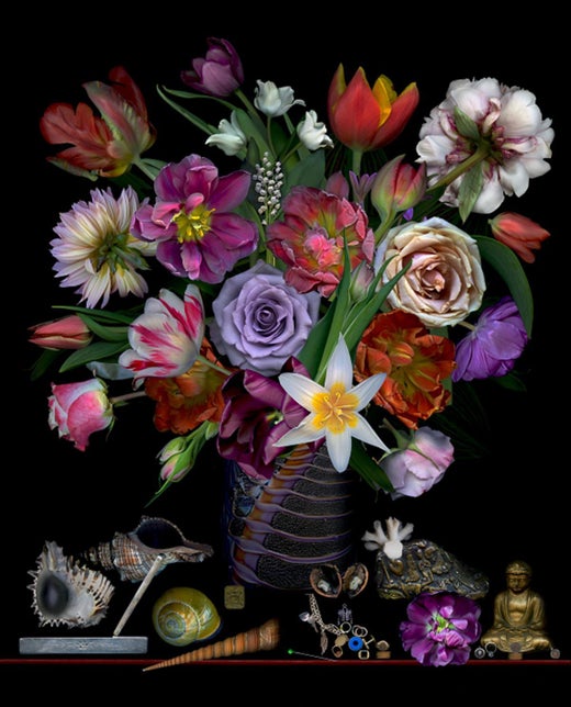 As an artist, He is fascinated by the opulence and richness of still life of the golden age of Dutch painting in the 17th c. These works, of course, symbolize mortality and the temporal nature of material goods. In his still life, He built these images with the same symbolic references but with the best quality, you can get. By playing with light and dark, He captures the beauty of every flower and each object down to the smallest detail. In addition to photography, he uses high-resolution scans to achieve extreme detail. He use photography as a base, but in the end, he arrive at an image that nobody could actually shoot as a photograph.He is not a photographer in the traditional sense, but he does take many pictures and he needs a lot of layers. In his still life of flowers and objects, he creates a balance between objects and living materials with light and shadow and the best quality. He created the photographic illusion of a painting from the golden age in a new tech way by scanning every object individually and combining these with photographs that he took. The construction takes a lot of time and months of post-production. In his work, everything has to be perfect. It’s like a movie. The light and color have to be right. (It is quite obsessive work.) He loves the idea of “the impossible image” – the idea of there being no limits and of using the photograph as the basis for an image that’s in his head.