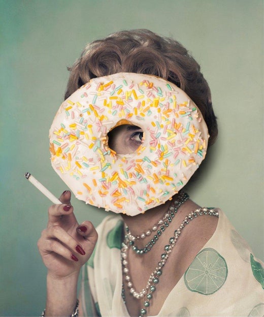 ABOUT THIS PIECE: "I often combine food with portraits. On the surface, this absurd combination appears to reject any sense of reason (an extension of my own twisted sense of humour). However, obscuring the faces of my portraits with food is designed to not only challenge traditional notions of beauty, but also to provoke, tease and confuse the observer. I don’t set out to control the outcome of any piece but rather I want the observer to empathise with the subject through subtle suggestion. By concealing the faces, I remove any distraction and invite the observer to slow down and join the dots in order to seek out the hidden. I guess the real power of the final composition is what can’t be seen. At this point the observer holds all the power and the artist none! Although my mental approach is analogue, my physical techniques are digital. In order to avoid digital excess, I employ a self-imposed ban on using any more than two, and on the rare occasion three, elements." Harriet Moutsopoulos