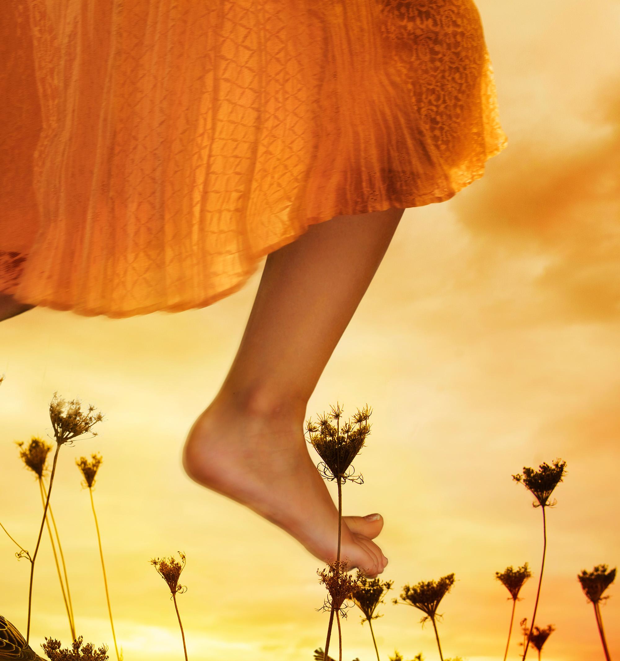 Tom Chambers"Marsh Flight" Whimsical Photograph with Figure Jumping Over Flowers with Birds