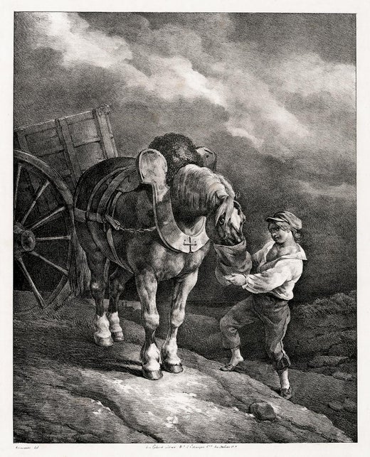 Théodore Géricault, 'Garçon donnant l'avoine à un cheval dételé' (Boy Giving Oats to a Hitched Horse), lithograph, 1822, 2nd state of 2, Delteil 89. Lettered inscription: "Géricault del", "chez Gihaut Editeur. Md. d'Estampes, bard. des Italiens, N 5". Rendering by Joseph Simon Volmar. Printed by Villain. Published by Gihaut Frères.