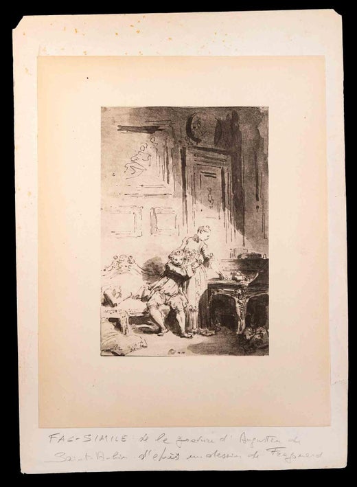 Young Lovers is an original artwork, lithograph, "d'après" after an etching of Augustin de Saint-Aubin after a Fragonard's drawing. Is not signed and dated but we can attribute the period to 19th Century.
