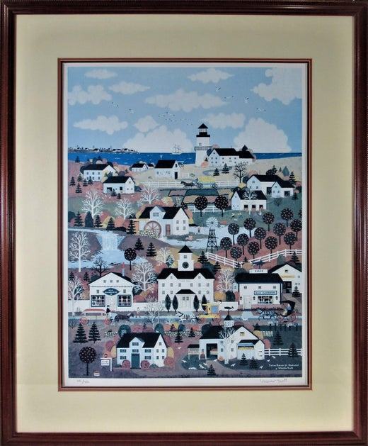 This artwork titled "Indian Summer in Nantuckett" is an original offset lithograph on wove paper by American artist Jane Wooster Scott, born 1933. It is hand signed and numbered 681/750 in pencil by the artist. The image size is 27 x 20 inches, framed size is 39 x 32.25 inches. It is beautifully framed in a custom wood frame. It is in excellent condition.