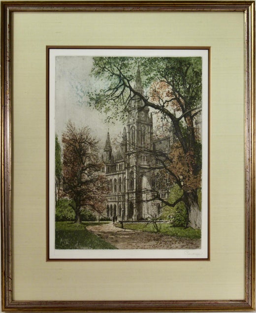 This artwork titled "Heidelberg" 1928 is an original color etching by Austrian artist Luigi Kasimir 1881-1962. It is hand signed in pencil at the lower center by the artist and titled, dated November 19 1928 in the plate. The plate mark (image) size is 13 x 10.25 inches, framed is 21.65 x 17.25 inches. It is custom framed in a dark wood frame, with light creme color matting and dark silver filet. It is in excellent condition.