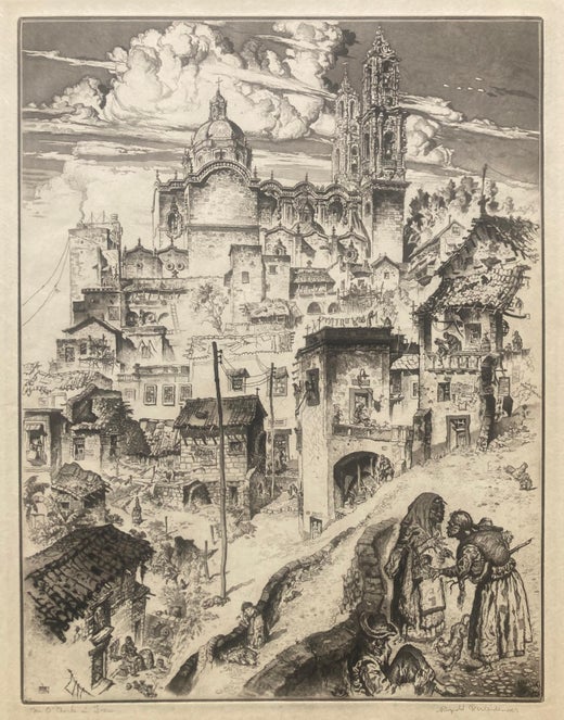 TEN O'CLOCK IN TAXCO 1946 Etching and aquatint on paper Edition: An artist proof (#2) apart from an edition of unknown size Signed and titled in pencil. Image: 17" x 13"; Sheet: 19.75" x 15.75”. One of a pair of large format Mexican etchings with incredible detail by a master printmaker. With margins as issued with original brown tape at the sheet edges.