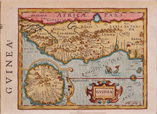 A 17th century hand-colored map entitled "Guineae Nova Descriptio" by Gerard Mercator and Jodocus Hondius, published in their 'Atlas Minor' in Amsterdam in 1635. It is focused on the...