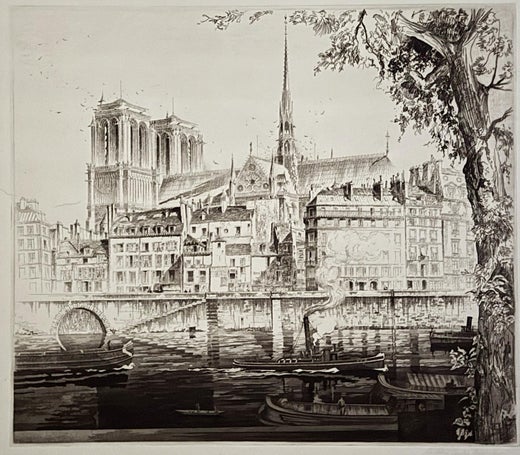 John Taylor Arms was born in Washington, D.C., in 1887. Arms studied architecture at Princeton and MIT and later became the country’s finest etcher of his age. His renderings of European and American architectural subjects are not only beautiful, but they are unrivaled in their technical virtuosity and nuanced light. In a recent exhibit, the Cleveland Museum noted, Arms believed that art could be a tool for the spiritual and moral improvement of mankind and that Gothic cathedrals represented the most significant expression of man’s aspirations. He viewed printmaking as a vehicle for disseminating images of subjects that would uplift and inspire contemporary society. He served as President of the Society of American Etchers and as an ambassador for American printmakers and printmaking throughout the world.