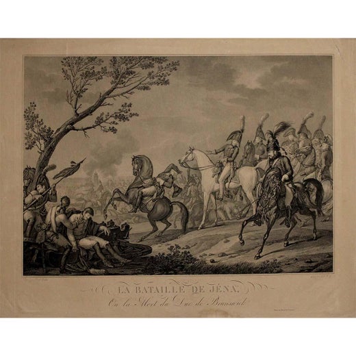 Beyond its narrative content, the print functions as a work of political memory. The Battle of Jena marked a turning point that confirmed Napoleon’s dominance over continental Europe. By monumentalizing this event, Vernet participates in the construction of a heroic Napoleonic myth, where individual sacrifice and imperial destiny are woven into a single image.