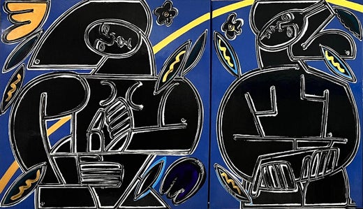 Focused on the human figure and the tales that emerge through the framework of shape, contour, and formal approach, Martin choreographs her forms in relentless flux. Her technique of freehandedly capturing her subjects yields unapologetic marks and a spirited palette that hums with the vitality and vigor of the world she creates. In addition to the figure, many of Martin’s works are populated with anthropomorphic elements such as birds, butterflies and flowers. For Martin, these elements provide both a contextual source of information, as well as symbolic significance, progressing the storyline as a representation of personality, mood, and character.