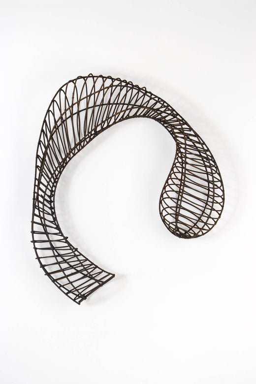 Eileen Braun delights in creating biomorphic or organic sculptural forms. Although they may look as though they're constructed of metal rods, they're actually created from rattan reed and string. Once complete she enrobes or patinates them. She has developed a technique using liquified rubber, which makes them dust resistant--they're incredibly easy to dust--and also makes them suitable for sheltered outdoor as well as indoor display. Overall, their looks and design make them a delightful surprise to viewers.