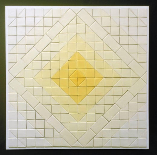 Organic, clean, minimal and meditative white and golden yellow sculptural wall relief that is ceramic on painted wood panel. 24 x 24 x 2 inches. A beautiful and tactile work of art f...