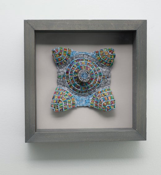 Jaynie Gillman Crimmins, a Brooklyn based artist, has been creating art from her shredded financial statements and mail since 2009. She currently works with her junk mail, which is difficult to recycle because the inks have high concentrations of heavy metals. Elevating the ordinary and overlooked aspects of our daily existence, her intimate pieces use an economy of means and restraint of process, inspired and influenced by Ruth Asawa’s practice and work. Frank Wilczek’s book A Beautiful Question reveals that symmetry and economy are the distinctive features of beauty in nature. Her shredded junk mail is sewn and rolled meditatively to create textural surfaces reflecting these notions. In this recent body of work, The Enlightenment will not bow to the Inquisition, Crimmins deftly manipulates shredded non-profit and political solicitations, health care statements and magazine articles, material choices that are clever, resonant and far from random.