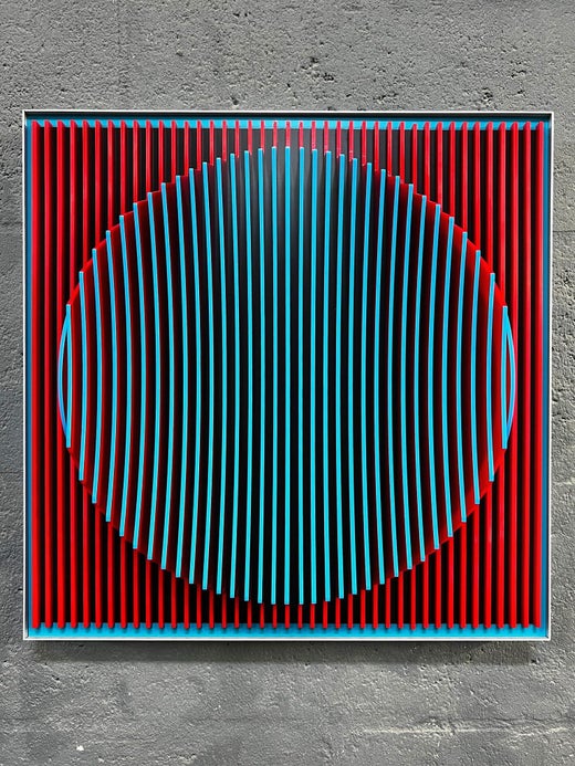 ‘Samscara’ is an abstract kinetic art sculpture created by Venezuelan artist Jose Margulis in 2023. Featuring multicolor plexiglass pieces whose subtle variation of height and colors...