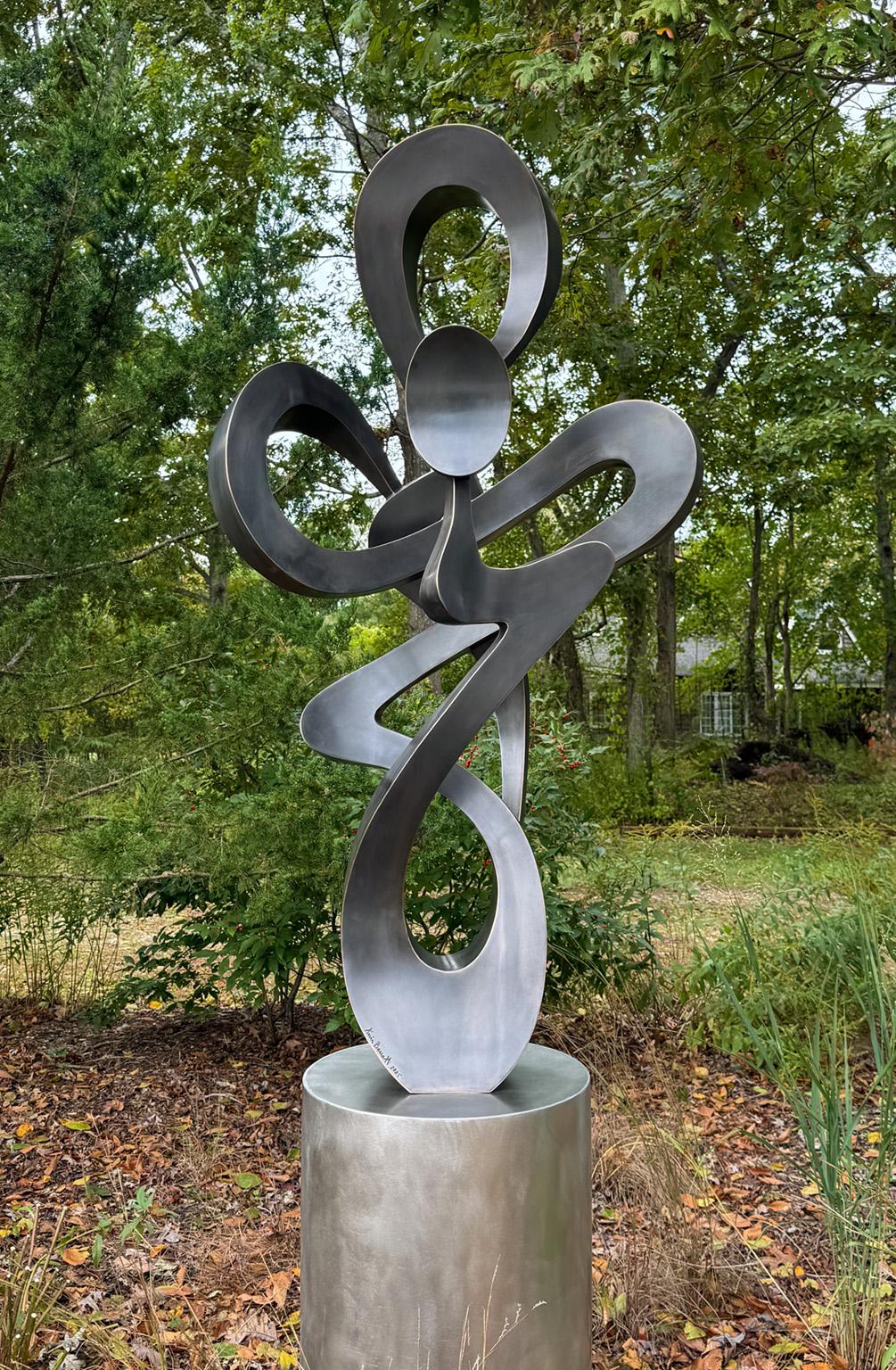 Indoor/outdoor sculpture in bronze. The sculpture is 65"h and rests on a 24"h stainless steel base.