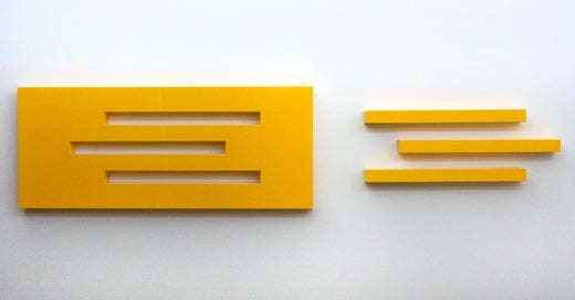 In shiny hot pink, two vertical rectangles sit side by side ‘in sync’ in this elegant wall sculpture by California artist, Lori Cozen-Geller.