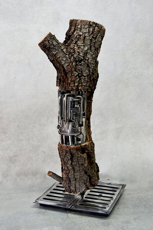 Bellino learned gold plating and silver plating from his time in his father’s atelier. While he worked for years in the restoration industry, it wasn’t until 2010 that Bellino changed course and expanded into sculpture full-time. Utilizing reclaimed bronze ornaments — including patinated forms rescued from antique flatware, furniture, lighting fixtures and decorative objects — Bellino welds and reassembles, producing a sculptural compendium of both real and imagined creatures. His steampunk-esque figures include dinosaurs, skeletons and insects, or objects such as violins and gas masks.