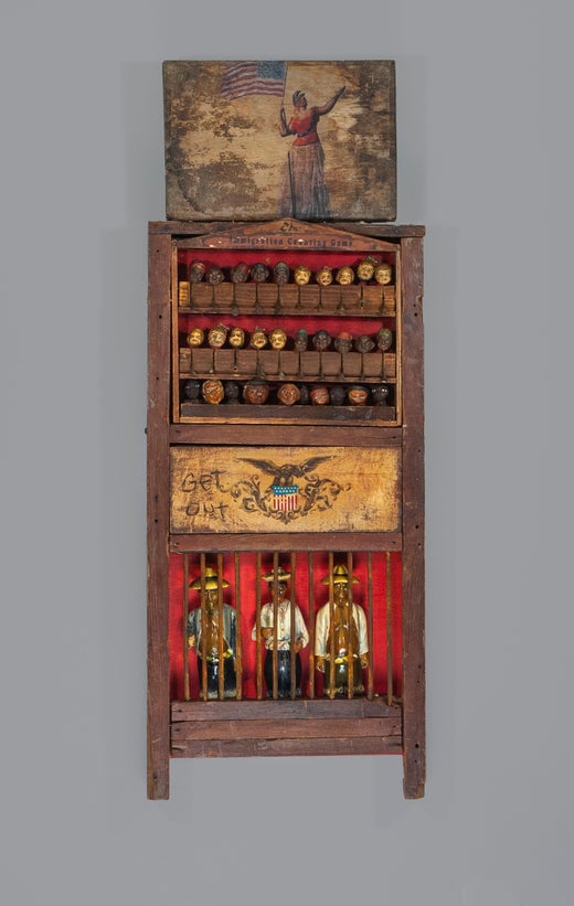 Kat Flyn is a self-taught assemblage artist working presently out of San Diego. She began her career as a costume designer in Southern California. Over the years she amassed a trove of artifacts and collectibles which she began using to create assemblage art in the 1990s. In 2000 she sold her business and moved to Cuyamaca, a remote community in the mountains outside of San Diego to devote herself exclusively to her artwork. In 2003, her work was interrupted when the Cedar Fire swept through San Diego County and destroyed the forest, her home and studio along with almost all of her collections and works of art. Following the fire, she relocated to San Francisco, where she spent a decade concentrating on her art in her studio in SOMA and exhibiting at galleries in the Bay Area. In 2015, she returned to San Diego and now works out of her studio in La Jolla, exhibiting there and in Los Angeles. Flyn refers to herself as an Assemblage Sculptor and her works as Political Art or Protest Art. She separates herself from other assemblage artists in that she only employs saved as opposed to found objects in her work; and her pieces always have a political or cultural narrative to them rather than being surreal or abstract. She also constructs or refashions many of the pieces which she uses in her art, a soft drink box into a tenement building (Affordable Housing 2017), a jewelry box into a wheelchair (Last Lily Foot 2016), an old shoe shine box into a hearse (Katrina 2018). The result is her work is closer in appearance to Folk Art than Assemblage Art.