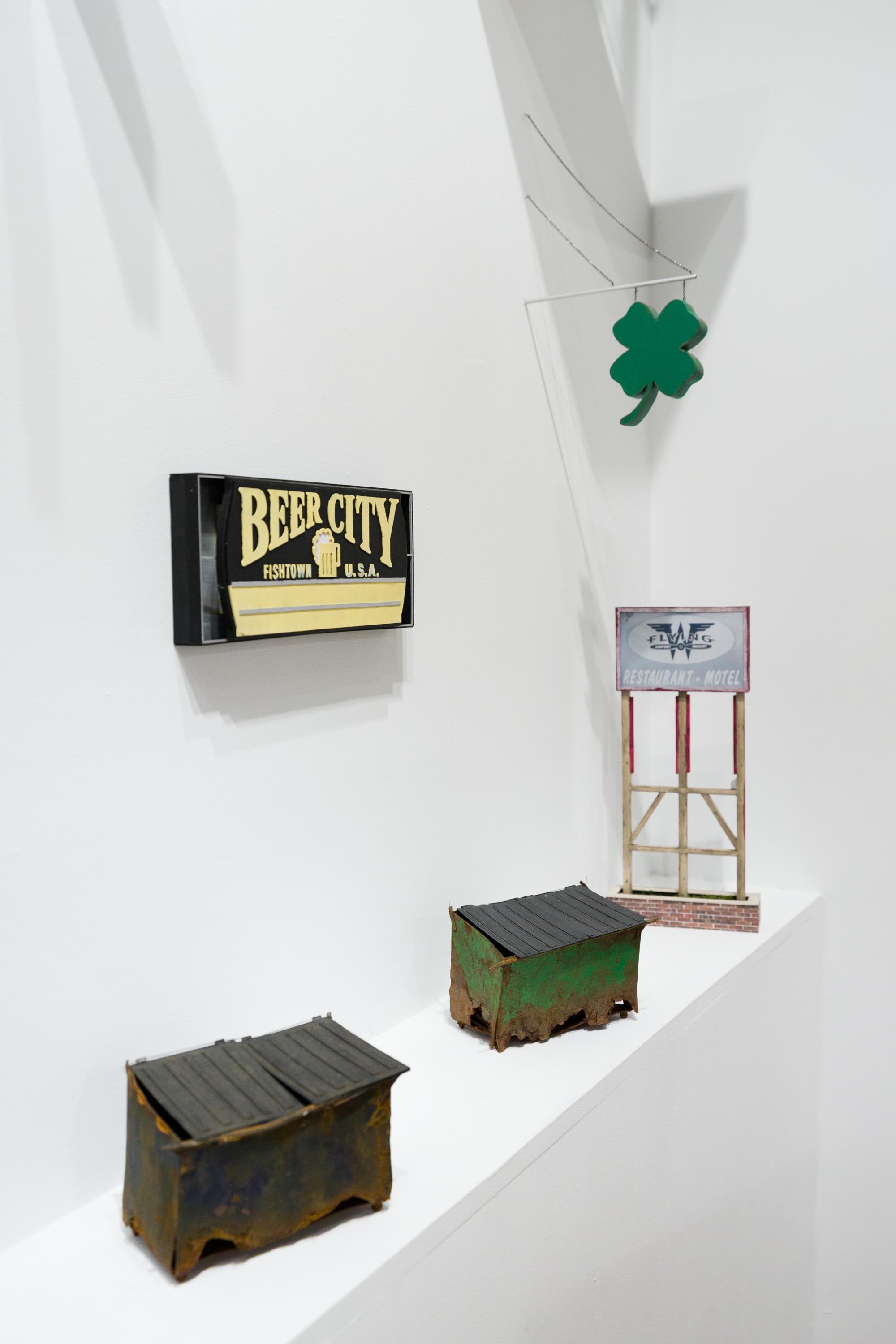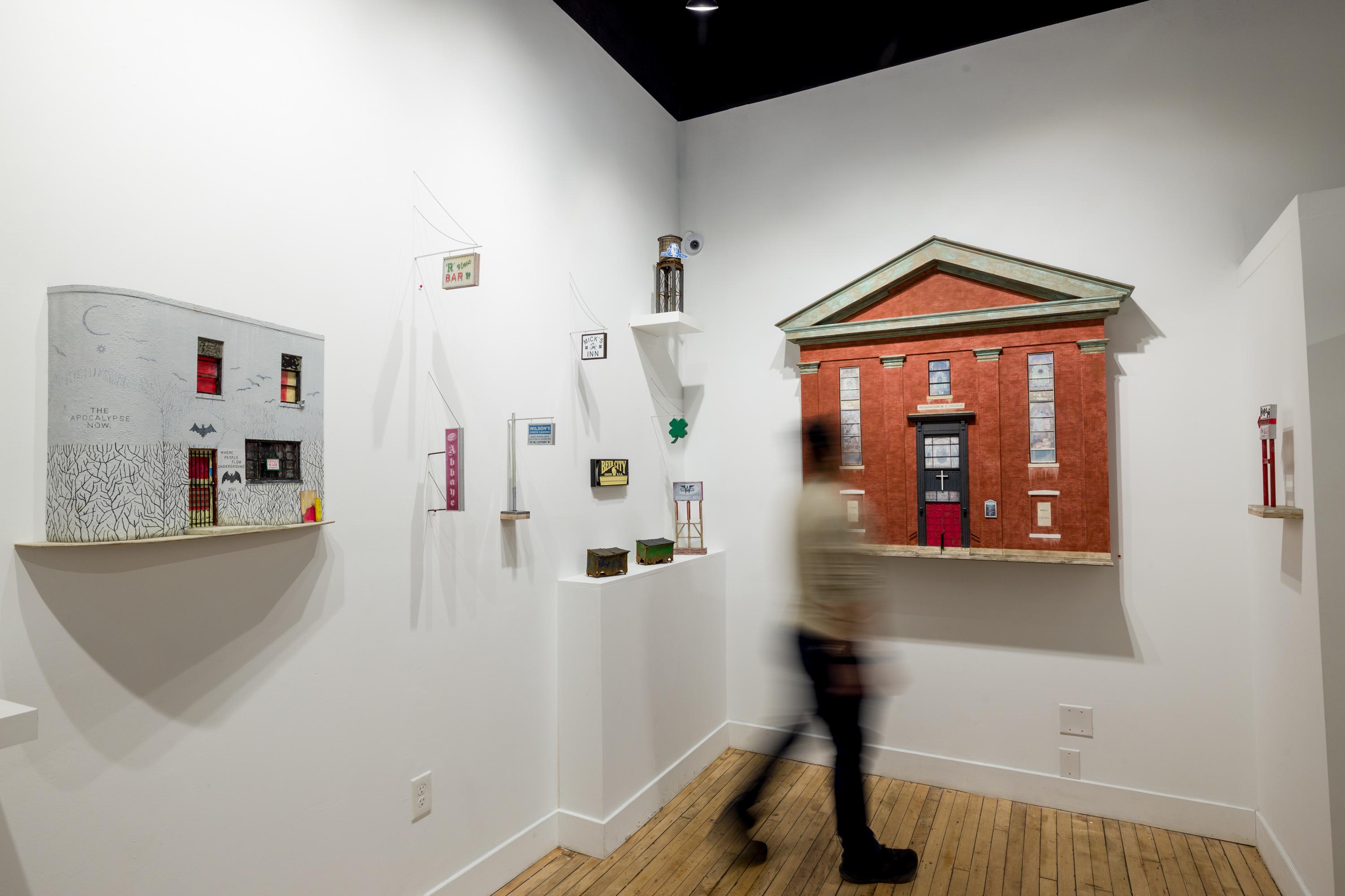Paradigm Gallery + Studio is pleased to present Amor Fati, the newest collection of documentary sculptures by Philadelphia-based artist Drew Leshko. In a blowout display of over 60 building facades, hanging signs, and rooftop superstructures, Leshko documents the ever-changing landscape of urban architecture from gentrification while memorializing the influential buildings from his neighborhood and beyond. Leshko works slowly and meticulously in hand-crafting neighborhood bars, corner stores, and music venues, primarily in paper and wood to echo the slow decay he witnesses from rising redevelopment. Instead of condemning the evolving landscape, Leshko reminds his audience to Amor Fati–love your fate–to accept change and move forward, acknowledging the good and the bad. With almost 20 years dedicated to capturing the essence of Philadelphia’s disreputable yet culturally significant sites in miniature form, Leshko’s sculptures are atypical monuments that unveil the emotional ties one can assign to weathered brick, faded signage, or rusted iron.