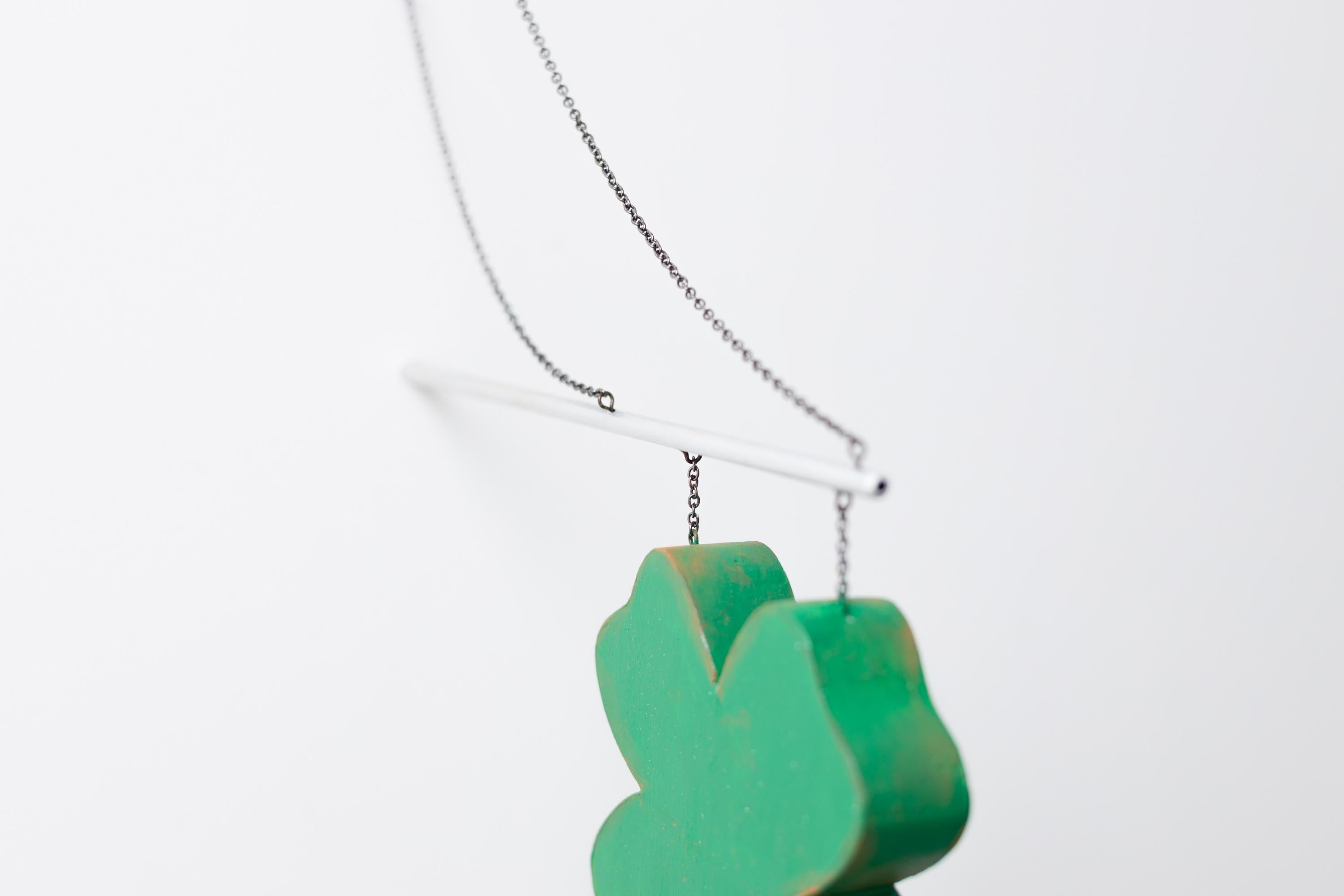 This piece titled "Shamrock" is original artwork made from paper, inkjet print, enamel, wire, chain, aluminum tube, pastel by Drew Leshko. This piece measures 13”h x 1.5”w x 7.5”d.
