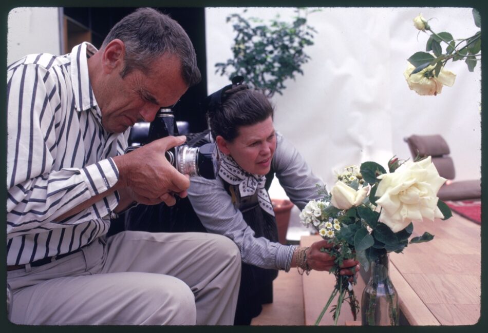 A photo of Ray Eames adjusting flowers as Charles Eames takes a photo of them