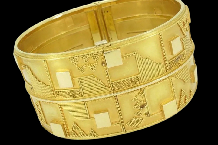 There’s a saying that earrings and necklaces are for others to enjoy, but rings and bracelets are for one’s personal enjoyment. The meaning, of course, is that jewelry worn on the hands and the wrists can be seen and appreciated by the wearer. And when it comes to this gold cuff bracelet, which is at once hefty and intricately detailed, there is much to be enjoyed.