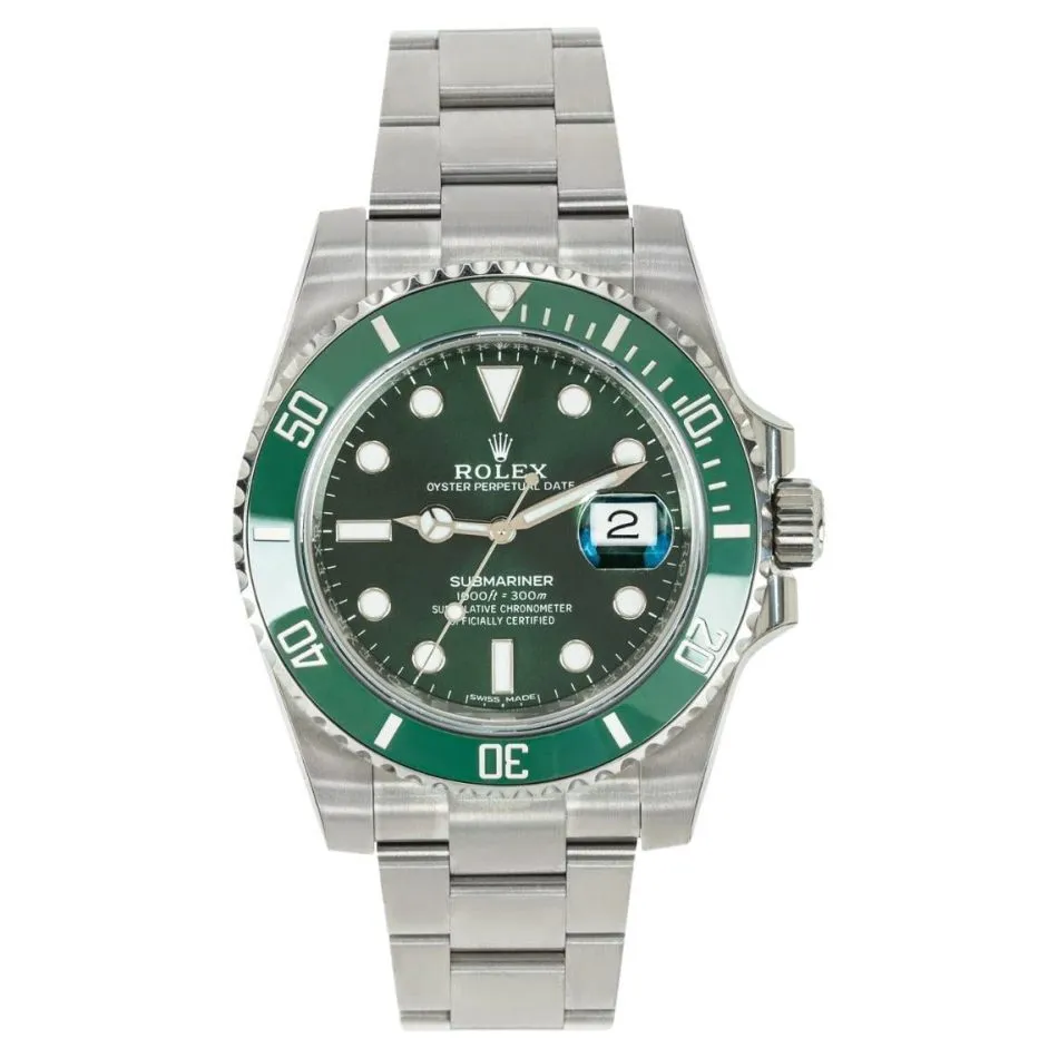 The bulked-up Hulk is the alter ego of Dr. Bruce Banner who, because of exposure to gamma rays, transforms into a raging savage to battle villains. Produced from 2010 to 2020, the Hulk was the successor to the Kermit, a Submariner with a black dial and green aluminum bezel produced from 2003 to 2010. The Hulk and the Kermit, which both have reference numbers ending in LV, for lunette verte, are rare because of their short production spans.