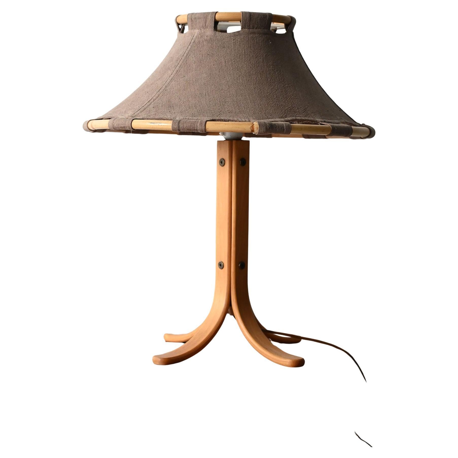 The lamp is made of bent wood with brass details. It wears its original beige canvas and...