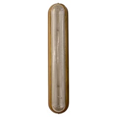Pair of Italian wall sconces produced in the 1950s, characterized by a minimalist linear design. Each lamp features a cylindrical opaline glass diffuser supported by a slender brass ...