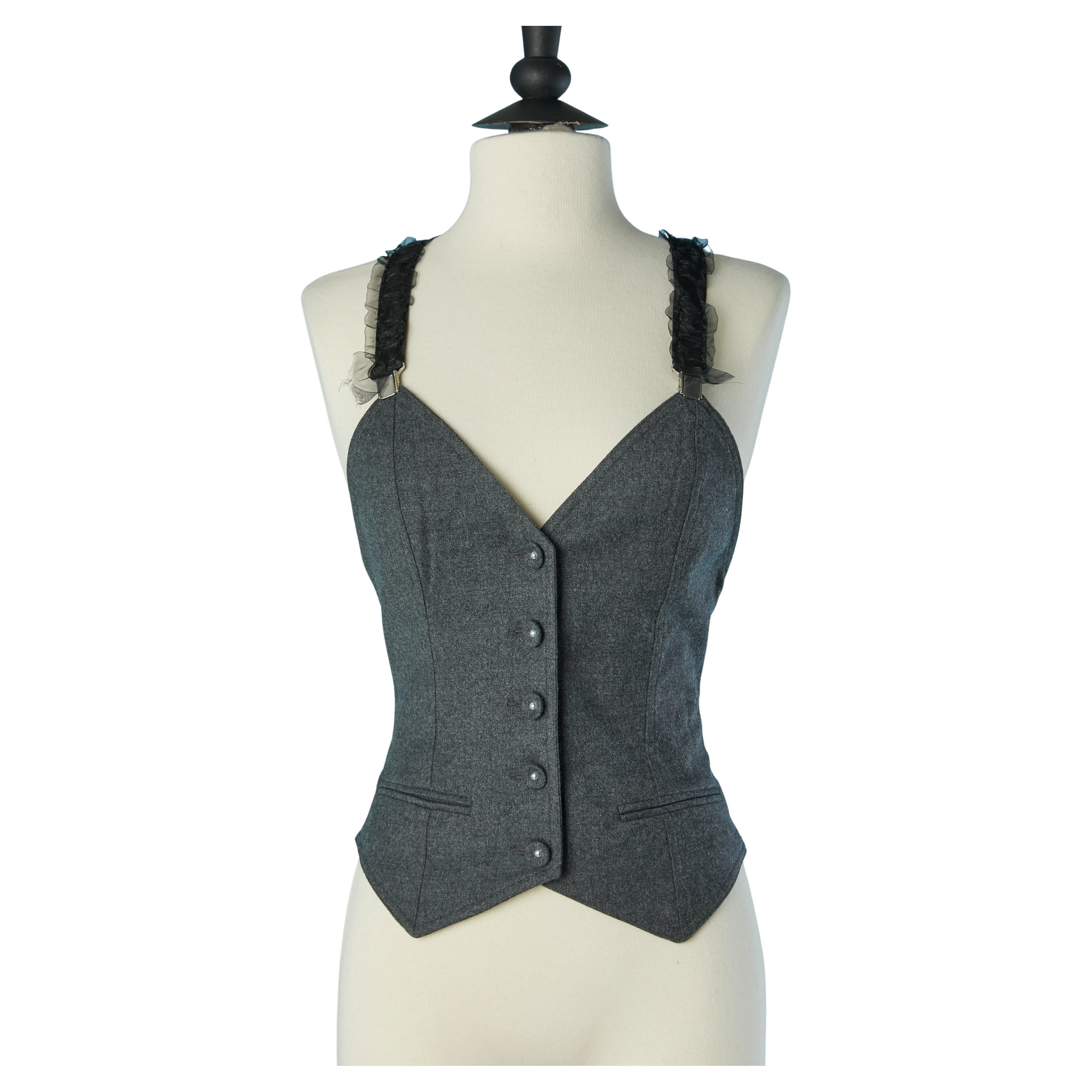 Grey flanelle bustier-vest with suspender and shiny ribbon on the top. Button and buttonhole closure on the middle front. Pocket on both side. Same fabric as lining.Adjustable should...
