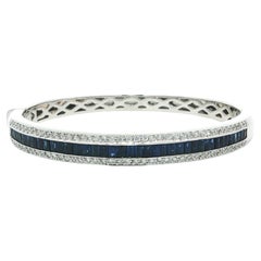 This Channel-Set Blue Sapphire Bangle Bracelet is crafted in 925 sterling silver and adorned with a continuous row of square-cut sapphires, the celebrated birthstone of September. Ea...