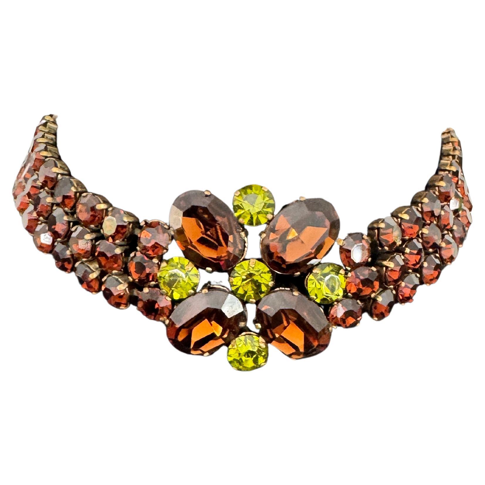 This set is breathtaking in person. A massive 3 strand Rhinestone choker, with a center Floral Motif. Color of Brown and Green look spectacular together. Rhinestones are prong set. H...