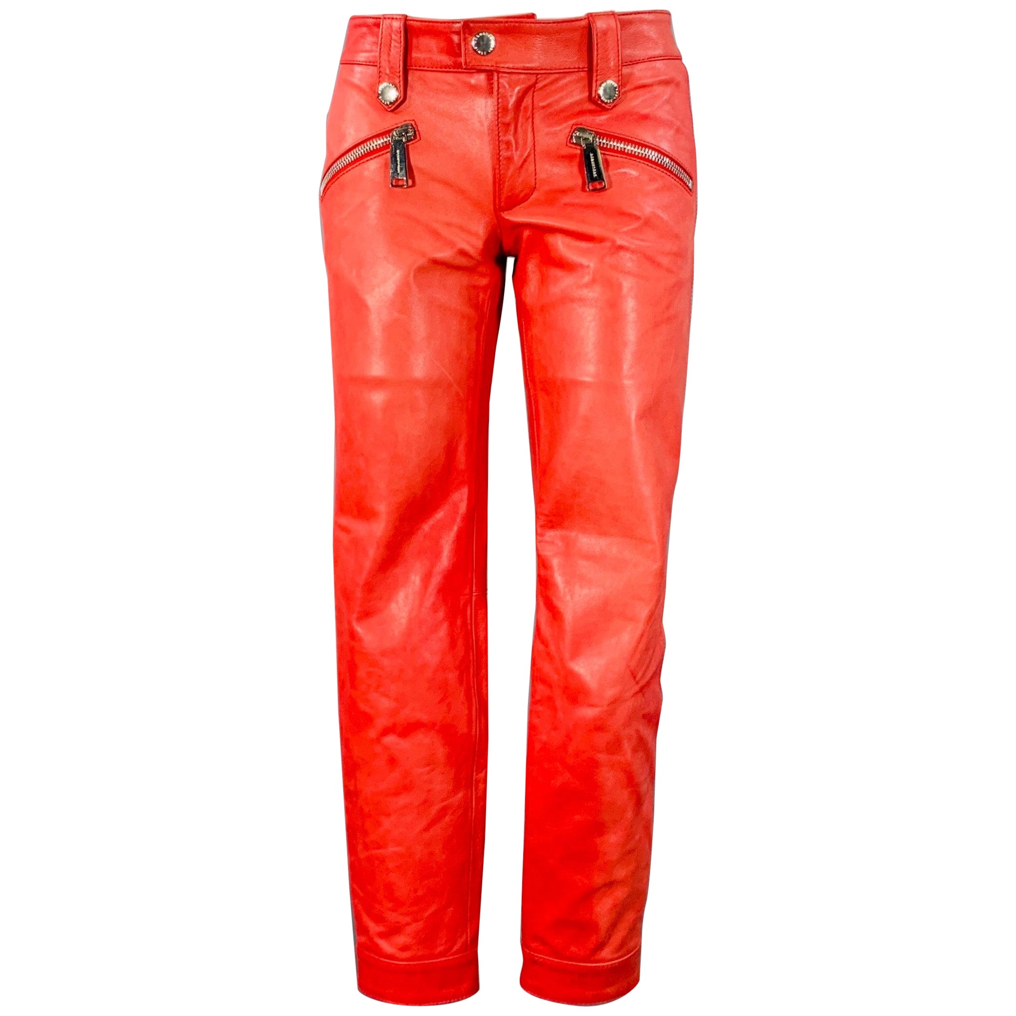 From Dsquared2’s F/W 2007 collection, this rare biker-style jacket embodies the brand’s glam-rock DNA at its peak. Crafted from super soft scarlet red lambskin leather, it features a sharply cropped silhouette with quilted seams, adjustable side buckles, silky red monogrammed lining and a double-ended heavy silver zip closure finished with Dsquared2 logo hardware. The oversized raccoon fur collar is fully removable, transforming the piece from decadent après-ski to pure high-octane biker. Sleek, sculptural, and unapologetically sexy, this jacket captures the high-gloss energy of the era’s supermodel uniform: part rock star, part bombshell. Made in Italy.