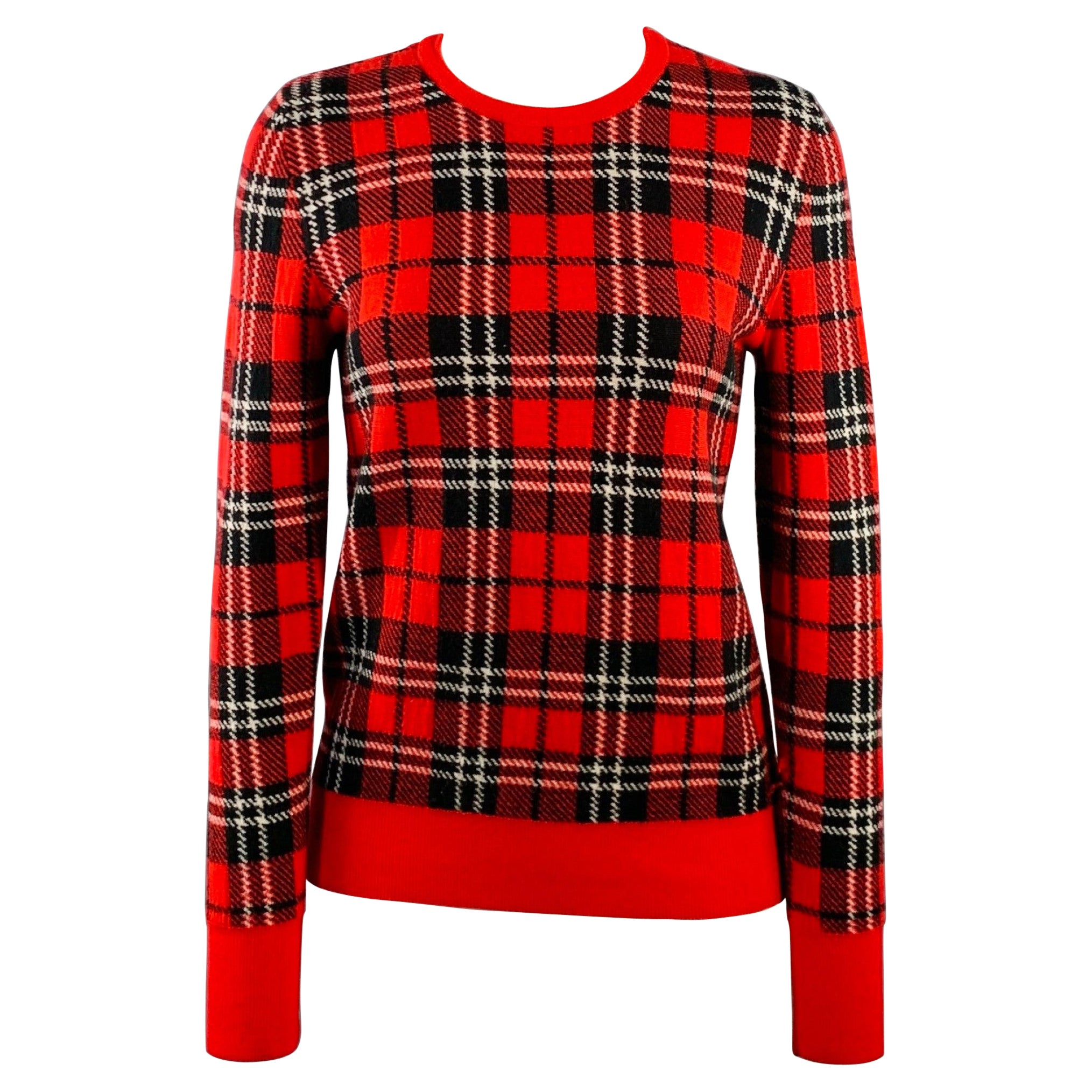 in a red, black, and blue wool blend knit featuring a plaid pattern, contrasting red ribbed trim, and crew neck.Very Good Pre-Owned Condition. Minor pilling and sn...