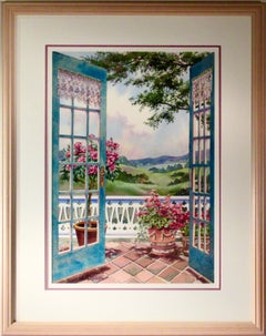 1900 s French Impressionist Watercolor Portrait Lady Overlooking Balcony Garden