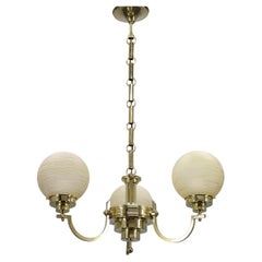 Italian chandelier from the 1950s, composed of a brass structure with three opaline glass shades. Each shade is positioned on a curved brass arm, arranged around a central joint that...