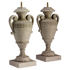 Pair of antique alabaster / white marble table lamps, carved in the shape of neoclassical urns on a square base. 4" x 4" x 16" / Total Height Approx - 24" (Width x Depth x Height)