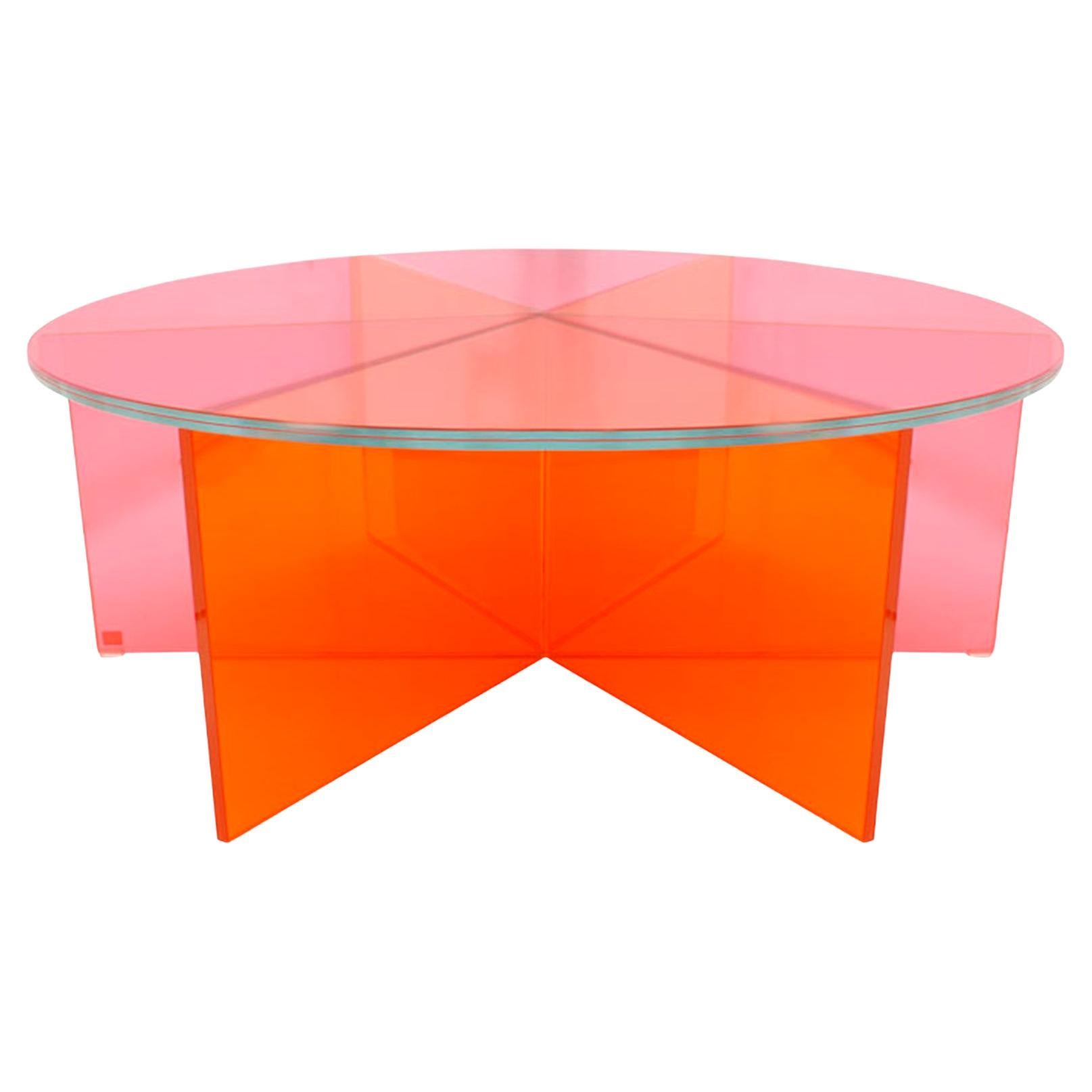 XXX low table is shown here in the transparent pink, orange and yellow coloured glass, and in the large size of the two tables. Low table realized in transparent pink, orange and yel...