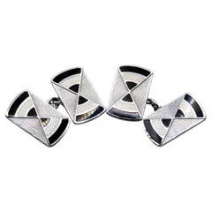 This highly unusual 1930s Art Deco cigarette case presents a fantastical scene in bold, raised, metal and enamel. A classic harlequin, rendered in geometric and cubist-inspired forms...